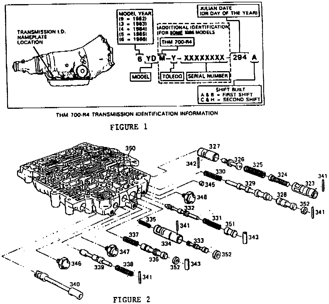 Beginning on October 21, 1985, or Julian Date 294 (refer to Figure 1) all 1986 THM 700 R4 transmissions have been built with control valve assemblies that do not use a throttle valve sleeve (refer to item # 327 in Figure 2) with the throttle valve (item # 326). When servicing 1982 through 1985 model year transmissions, this new assembly will be used, as current service parts stock is depleted.