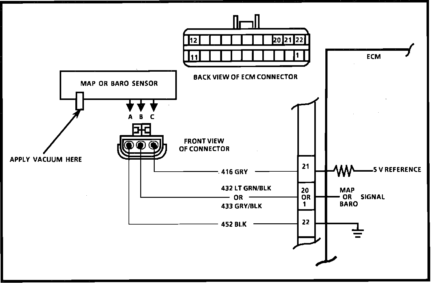2. This checks to see if the rate of change of the output vs. change in pressure is correct. Again,the normal change would be about the middle of the range listed. The voltage should change as soon as the vacuum is changed. If it doesn't, it could result in detonation or a sag on acceleration. It could also be caused by fuel or a restriction in the hose to the sensor.