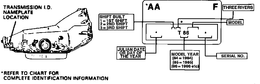 To repair this condition, a new throttle valve plunger and throttle valve bushing should be installed. Refer to Figures 1 and 2 for transmission nameplate identification information and to Figures 3 and 4 for service parts indentification. The chart provided indicates service package part numbers, transmission model applications and 1986 model start of production Julian dates for the THM 200C and 200-4R transmissions.