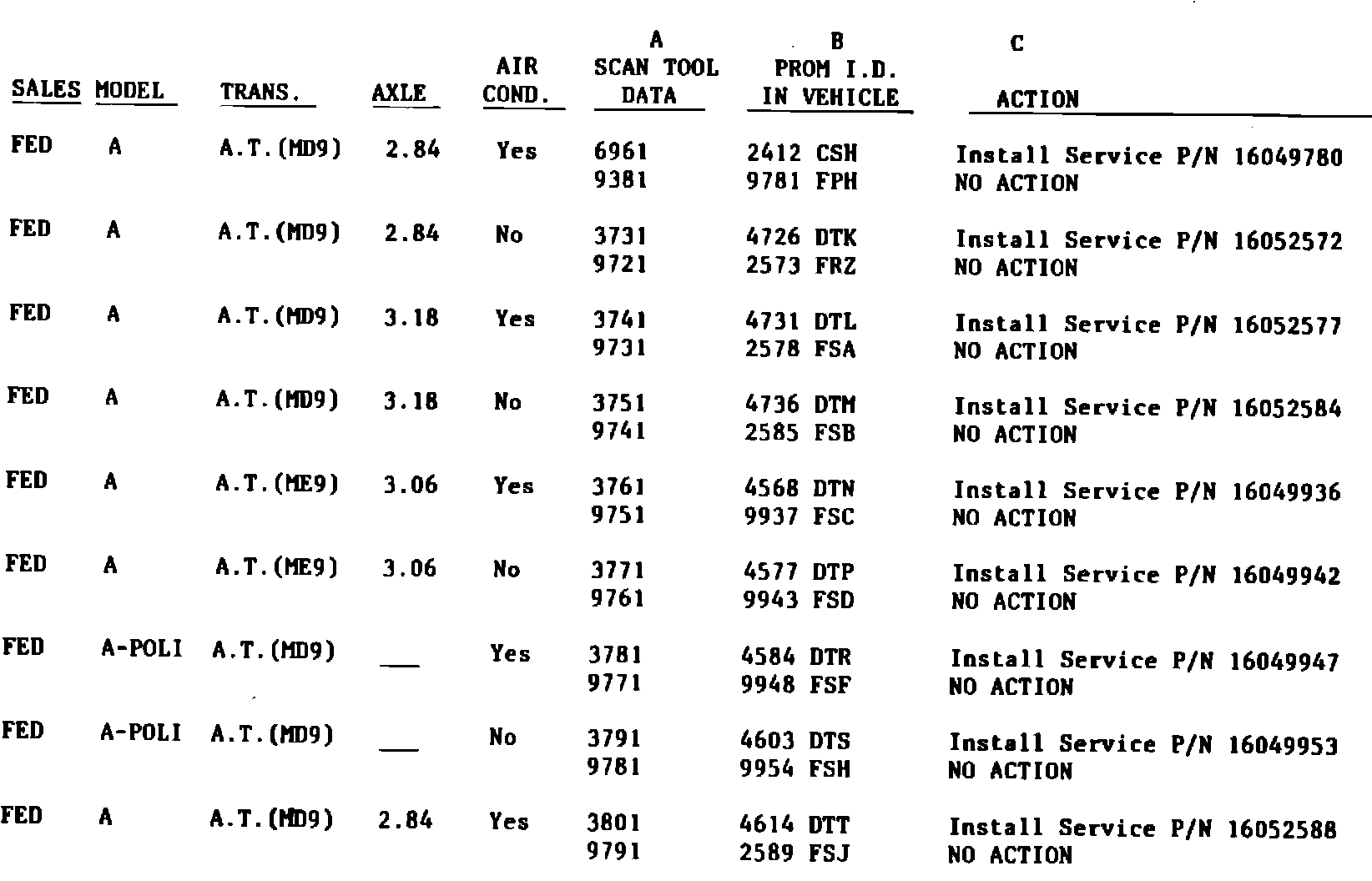If scan tool is available, determine PROM I.D. using a scan tool, find scan data in Column A of the chart and perform action in column C.