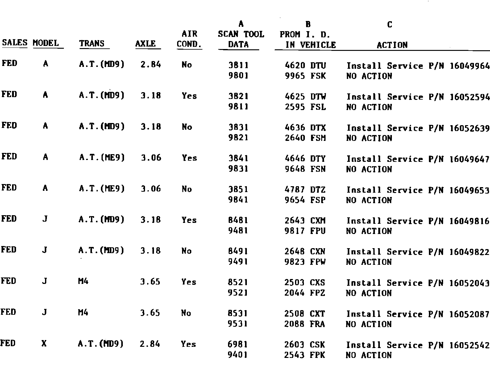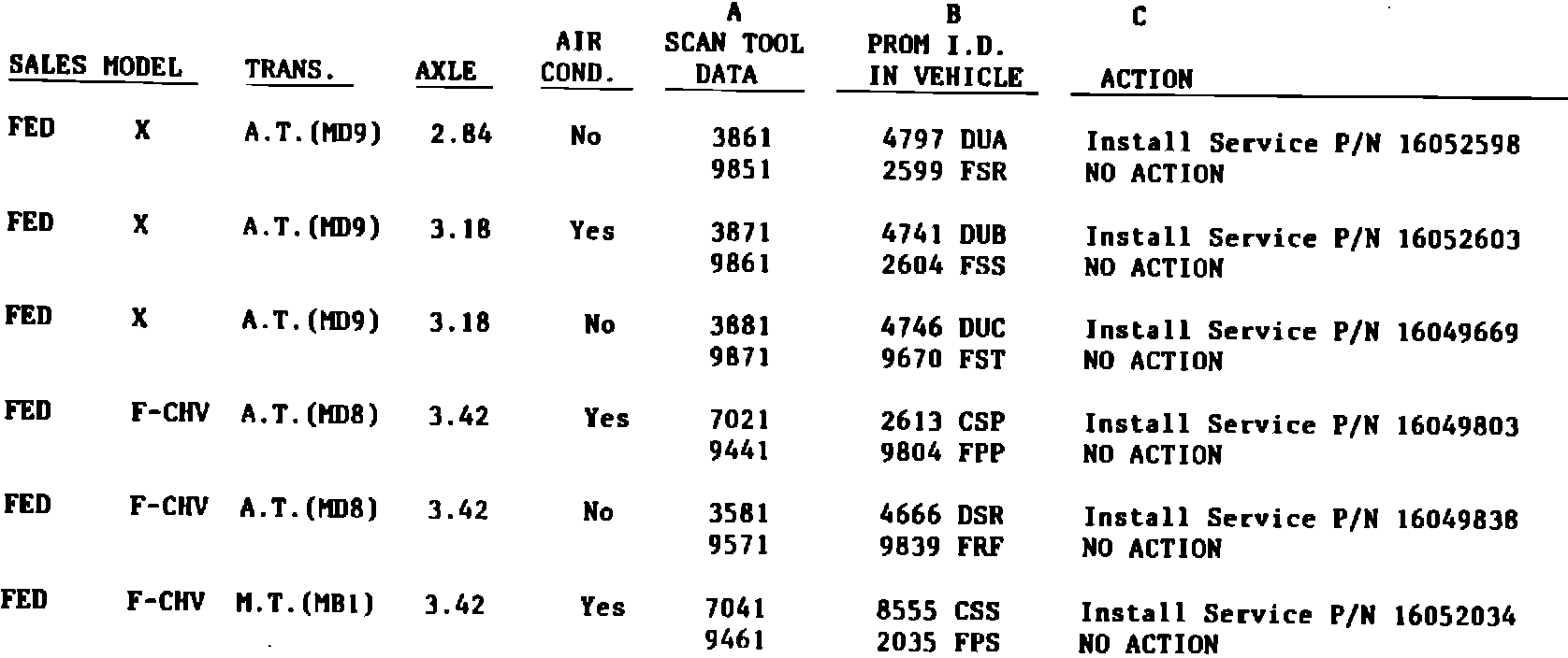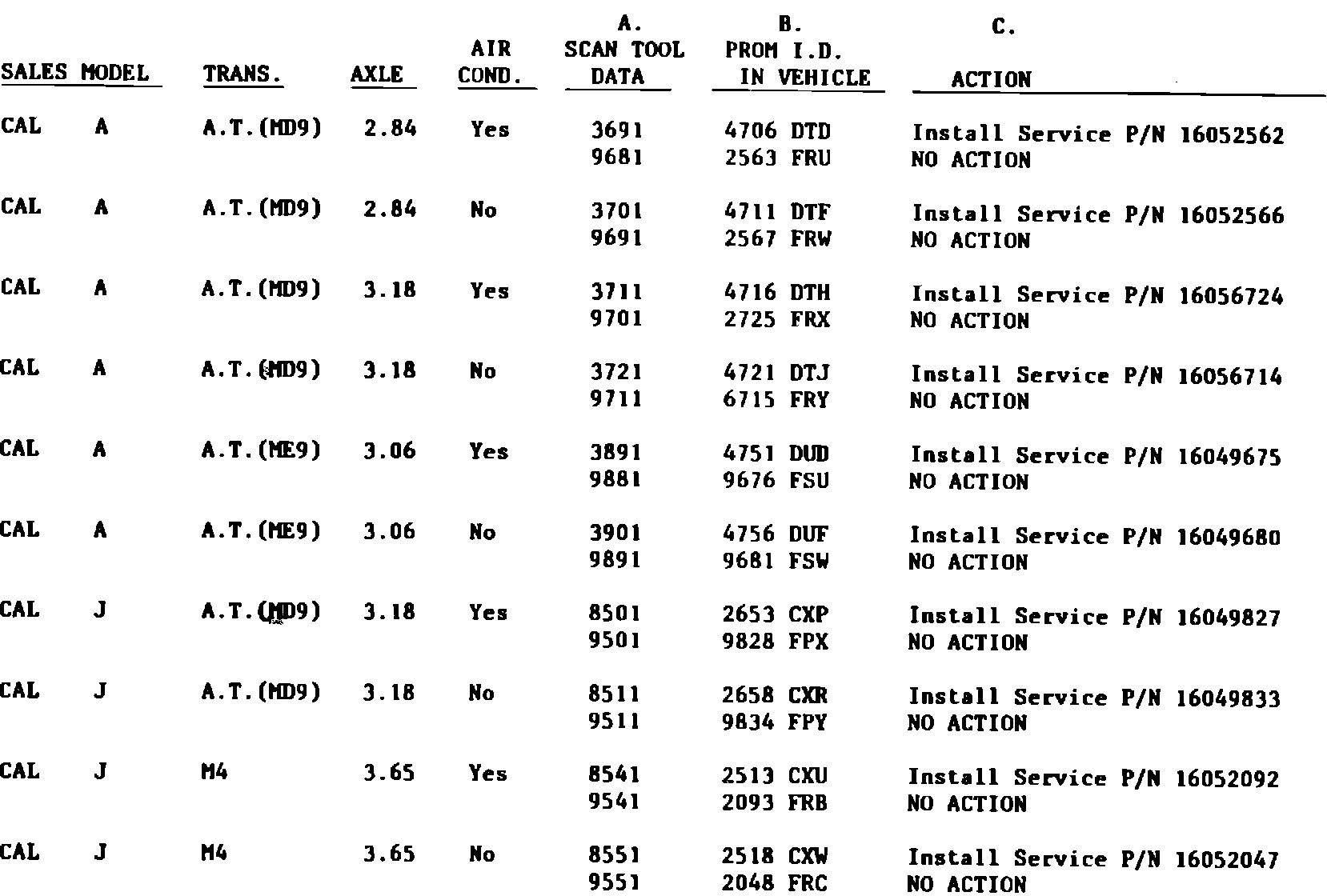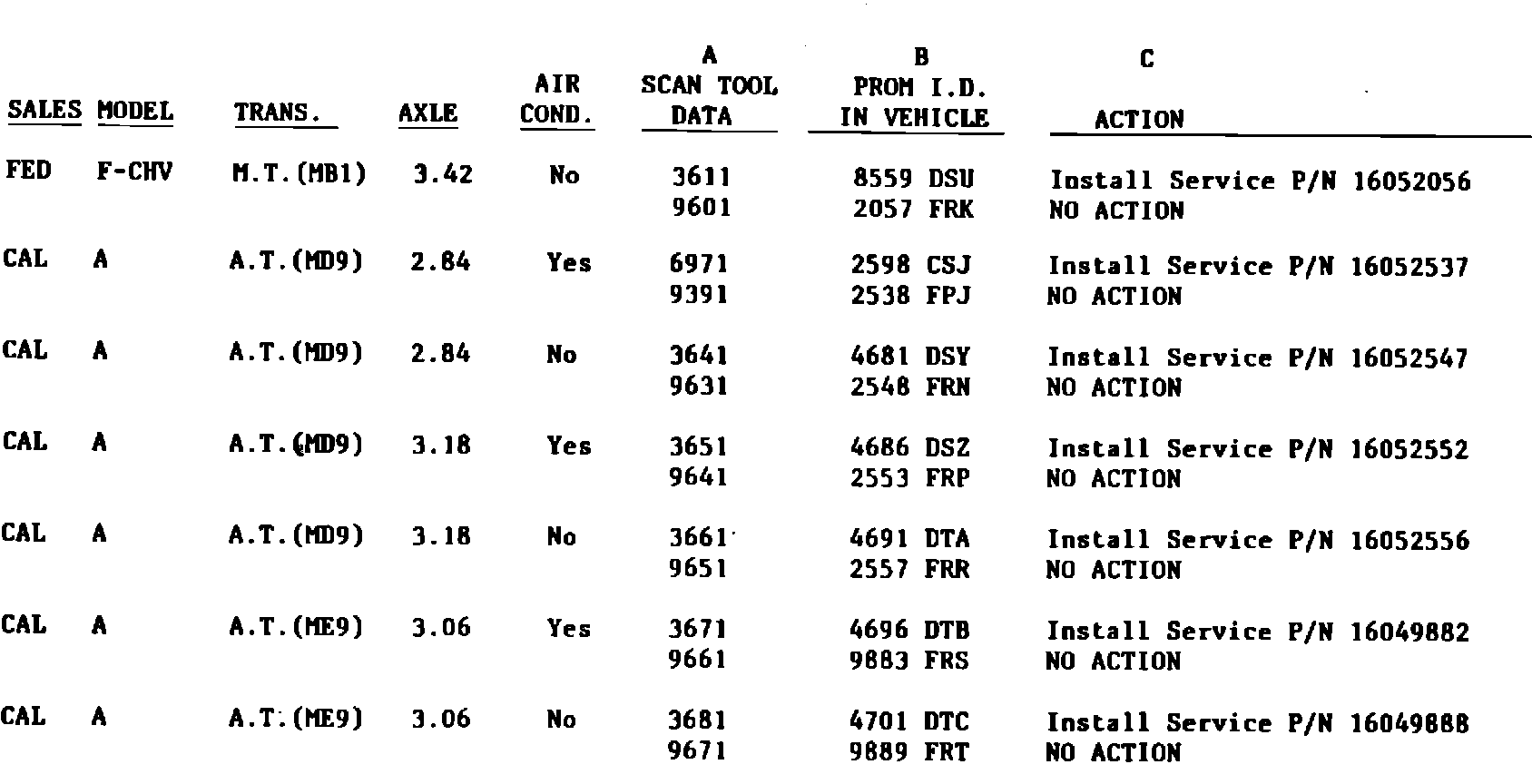 If scan tool is unavailable, remove ECM from vehicle and determine PROM I.D. by visually inspecting PROM. Find PROM code in Column B of the chart and perform action in column C.