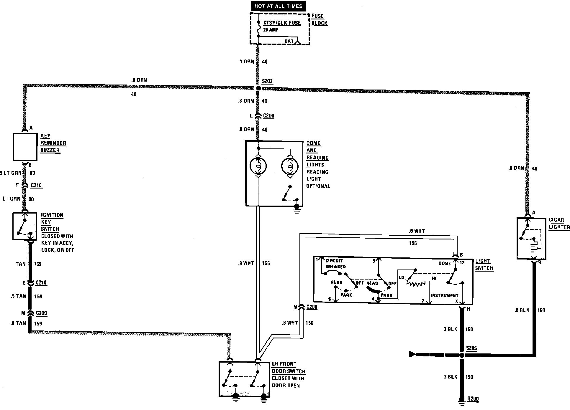 Fig. 21 Interior Lights, Ignition Key Reminder & Cigar Lighter Wiring Circuit. 1985 Chevette & T1000: