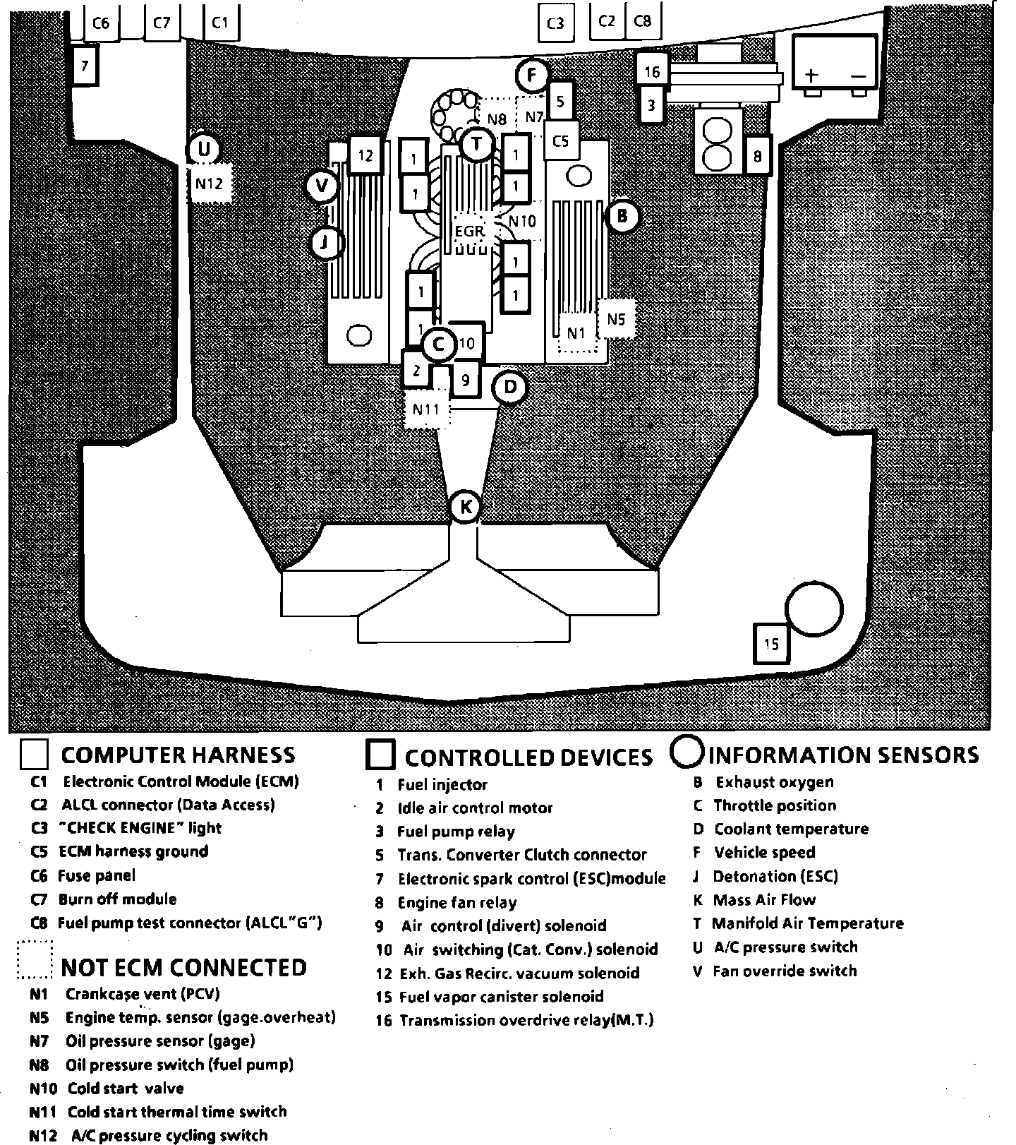 Fig. 31 Emission Component Location. 1985 Corvette W/V8-350/5.7L, PFI: