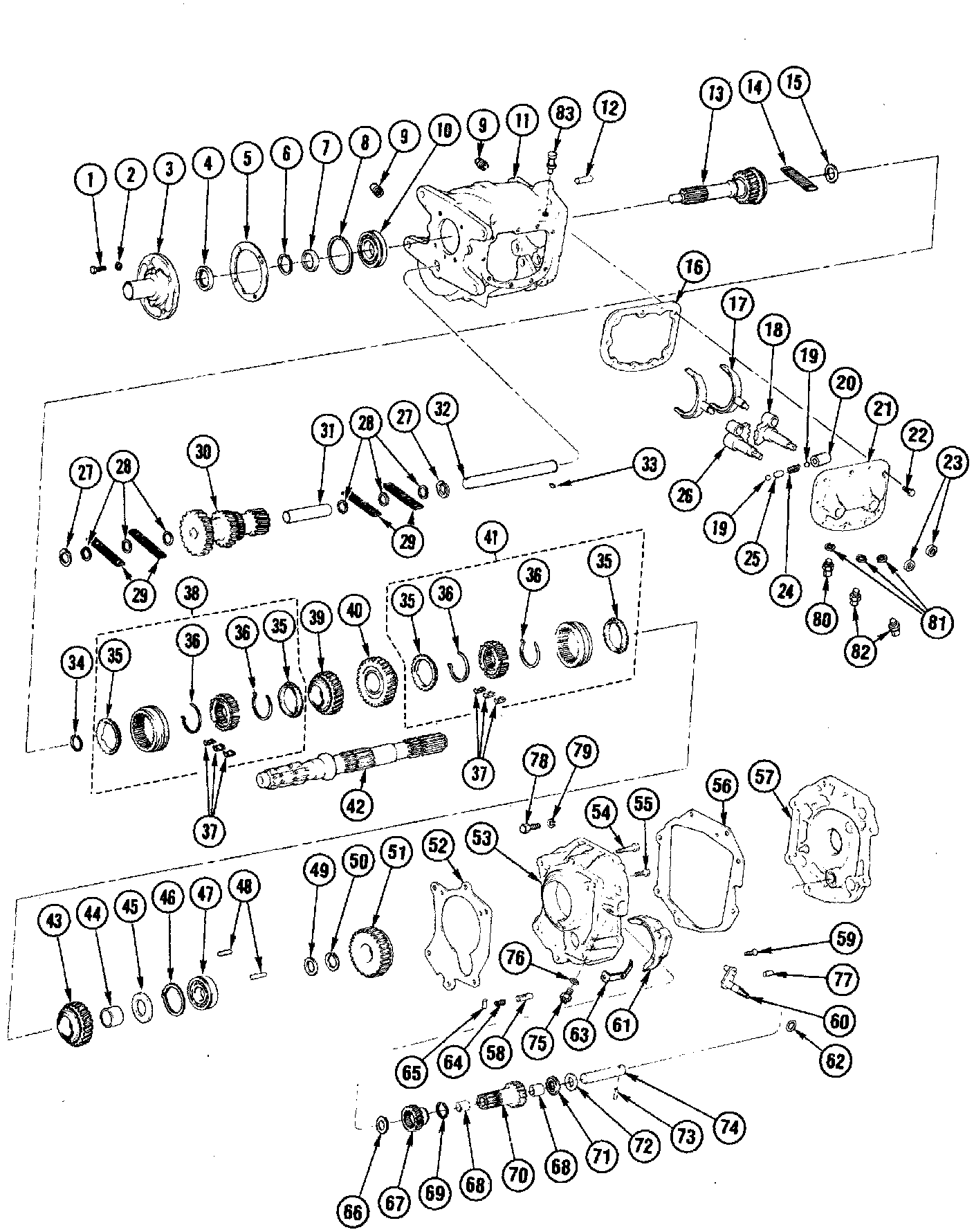 15. Remove countergear and two tanged thrust washers from transmission case. Check bottom of case for loose pilot bearings. Remove locating pin for reverse housing and any other loose components.