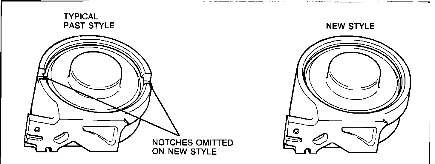 During the 1985 model year, a new style servo cover retaining ring (with tangs) is scheduled to go into production on THM 200-C, 200-4R Transmissions (Refer to Figure 1.) In addition to the new style retaining ring, the notches on the case intermediate servo bore, used for access of retaining ring removal, were omitted (Refer to Figure 2.)