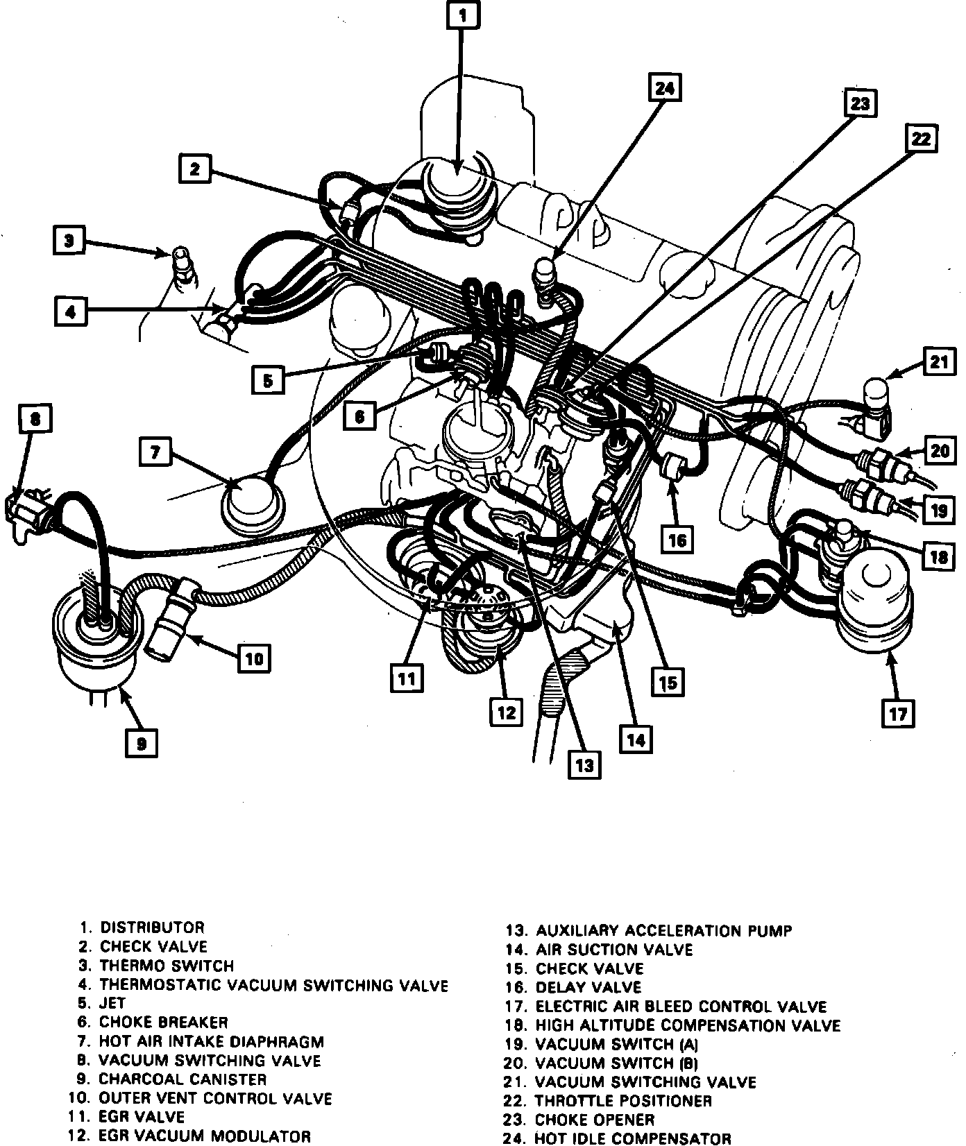Fig. 33 Emission Component Location. 1985-86 Nova W/4-97/1.6L OHC Engine Exc. Calif. Models: