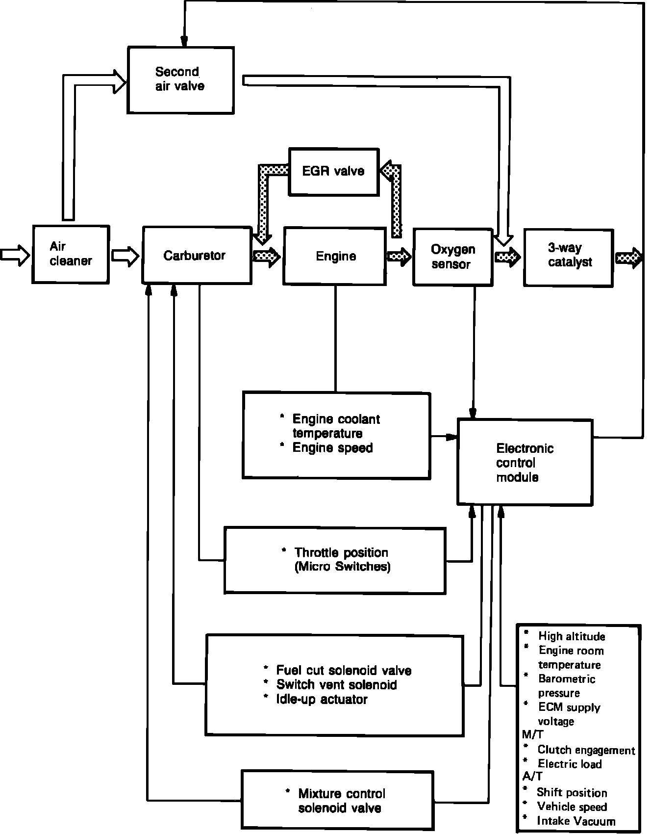 The Computer Controlled Emission Control (CCEC) system provides electronic control of engine air/fuel mixture ratio and idle speed, as well as the Pulse Air Control or Secondary Air Control and Fuel Cut and Evaporative Emission Control systems. These controls reduce engine emissions while maintaining acceptable fuel economy and driveability. CCEC system operation is controlled by an Electronic Control Module (ECM) which monitors engine and vehicle operating conditions through a group of sensors, computes ideal operation of the feedback, idle-up, fuel cut, pulse air or secondary air control and evaporative emission control systems based on input from the sensors and controls operation of these systems based on the computations, Fig. 1.
