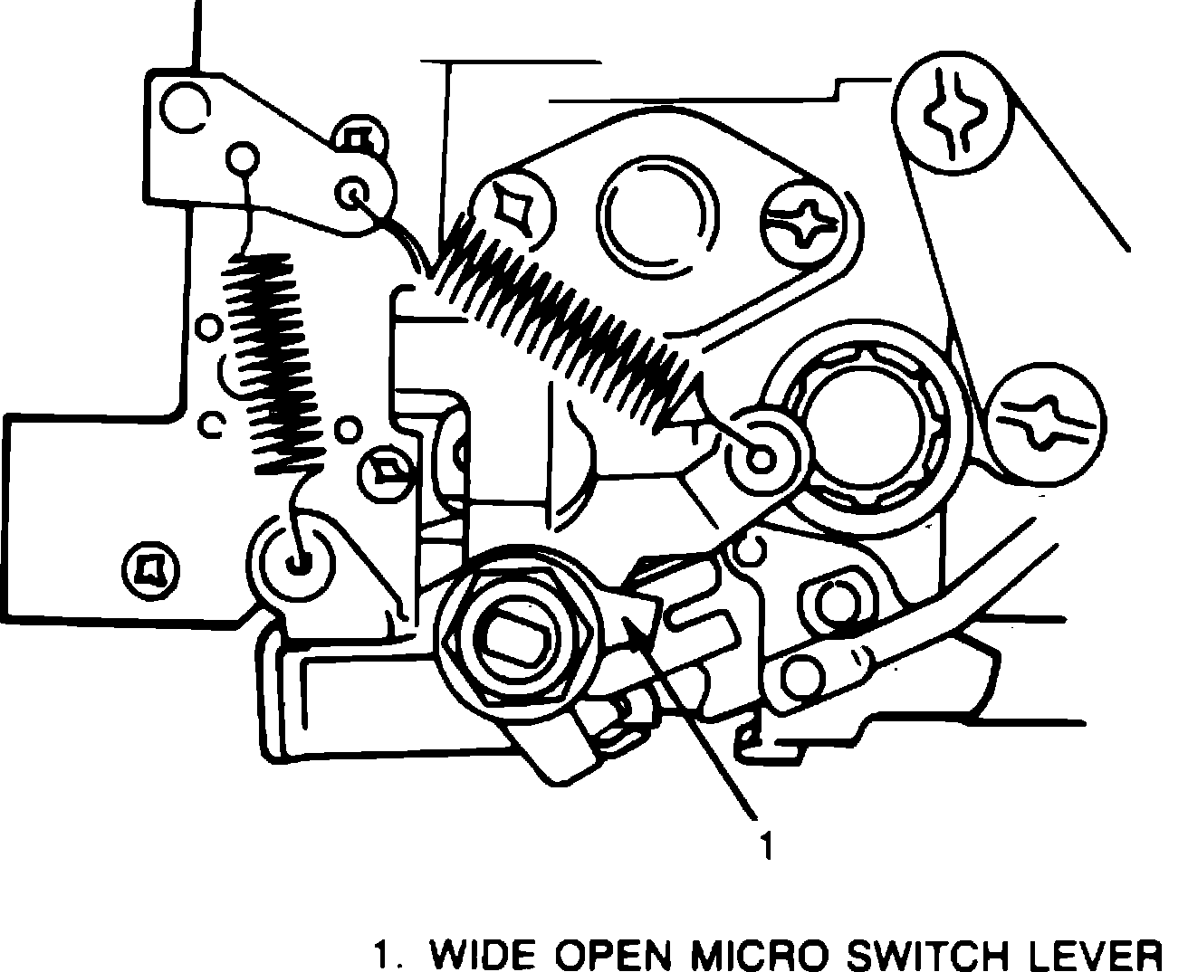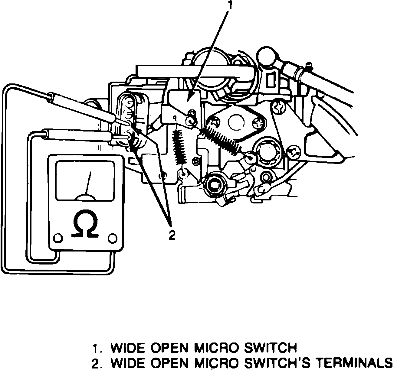 3. Open throttle gradually until ohmmeter indicates zero ohm. Measure clearance between throttle butterfly and carburetor bore, Fig. 13. Clearance should be .29 - .33 inch (7.2 - 8.4 mm). If clearance is out of range, adjust by bending lever, Fig. 14.