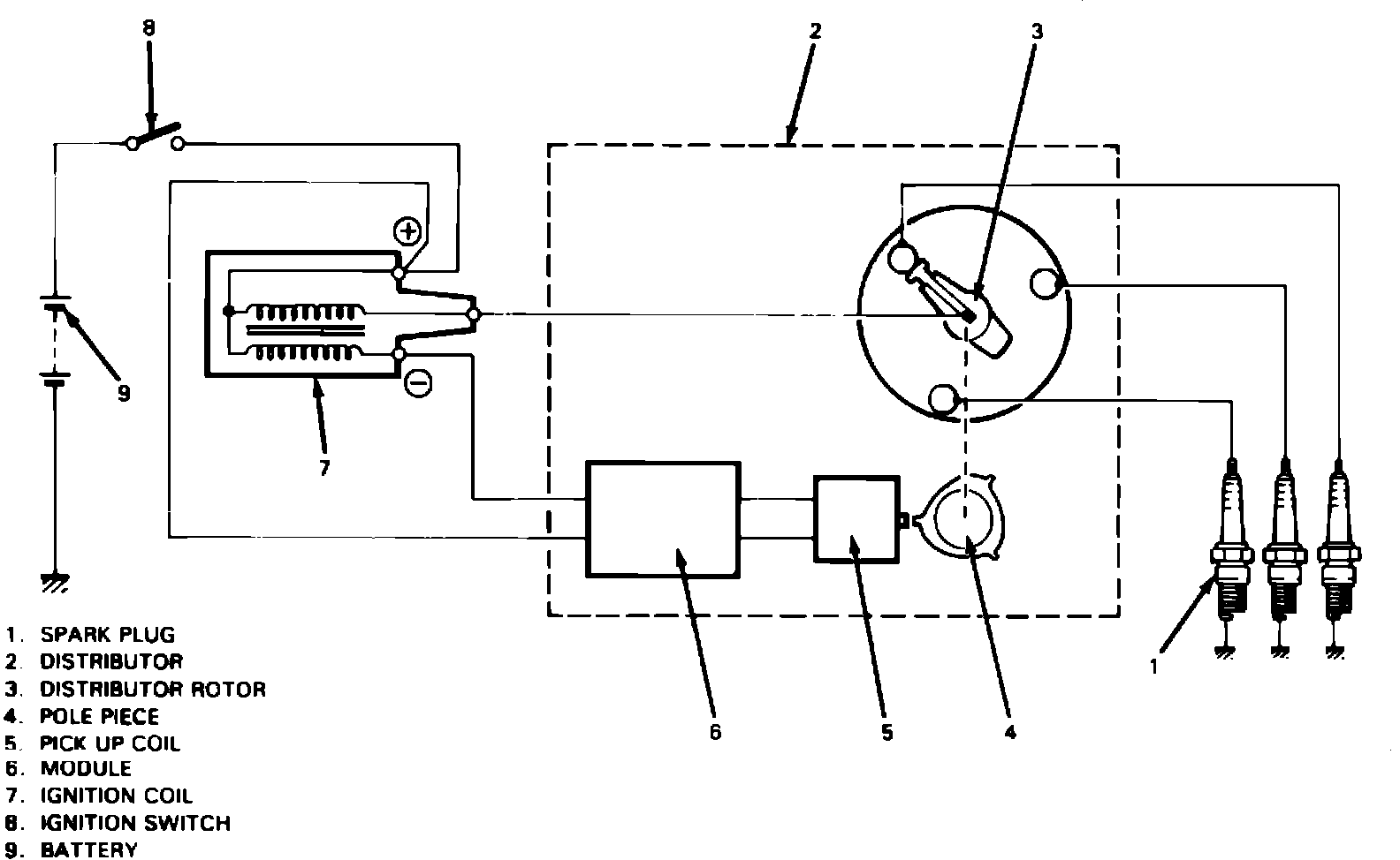 This vehicle uses a solid-state ignition system, Fig. 1. The distributor consists of a rotor, pole piece, module and vacuum and centrifugal advance units.