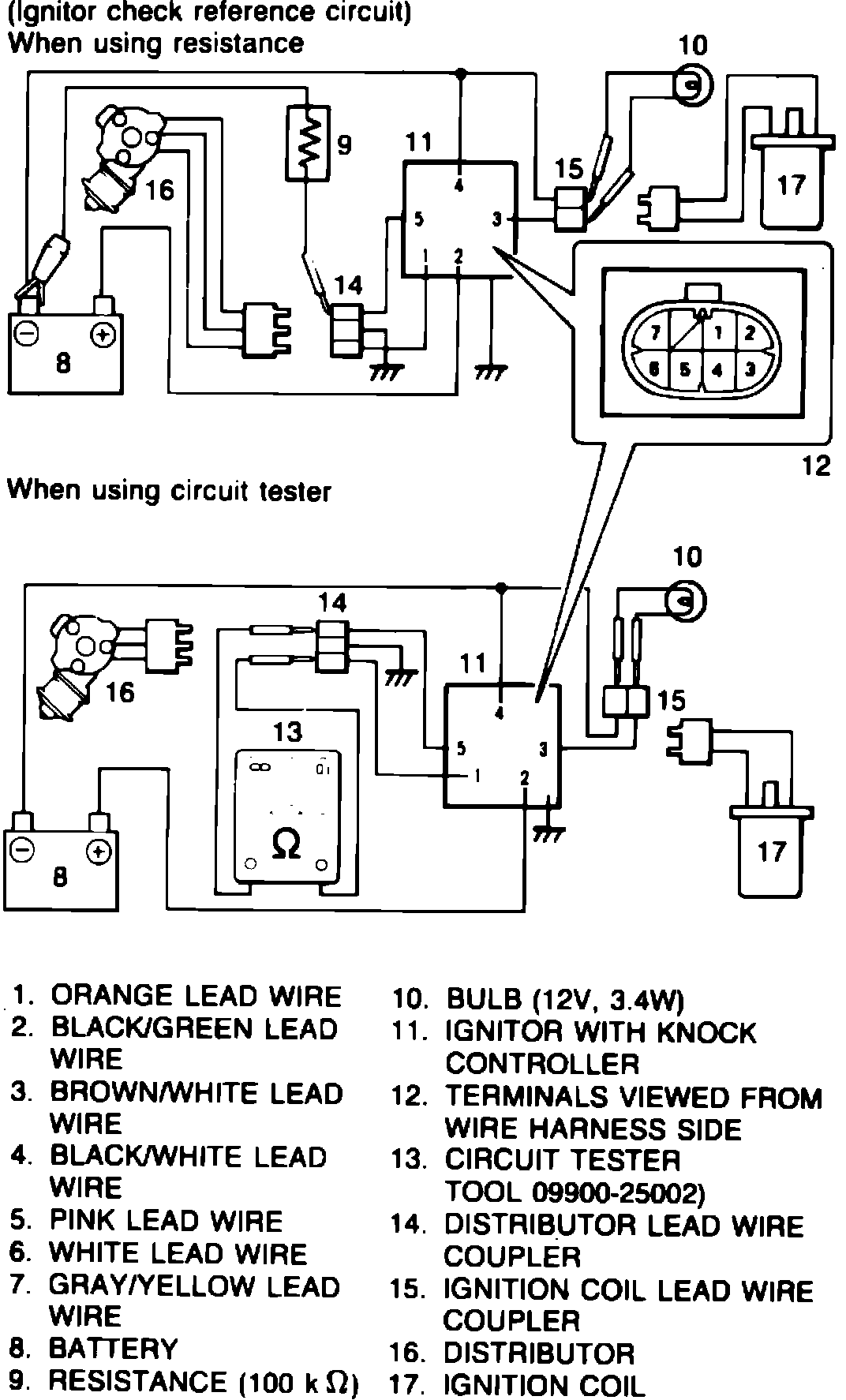 4. Connect 100 ohms of resistance between pink wire terminal of disconnected distributor connector and battery positive terminal, Fig. 8. If 100 ohms of resistance is not available, set circuit tester to ohms range, then connect positive probe of tester to orange wire terminal and negative lead to pink wire terminal, Fig. 8.