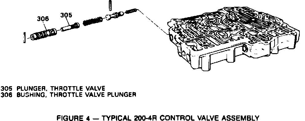 To repair this condition, a new throttle valve plunger, throttle valve bushing, and for some models a throttle valve lever and bracket assembly should be installed. Refer to Figures 1 and 2 for transmission nameplate identification information and to Figures 3 and 4 for service parts identification. Chart A provides service package part numbers, transmission model applications and 1986 model start of production Julian dates for the THM 200-4R and THM 200-C transmissions.