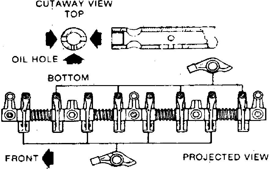 b. Assemble rocker arm assembly and face the oil holes of the rocker shaft to the right, left and bottom as shown in Fig. 7.
