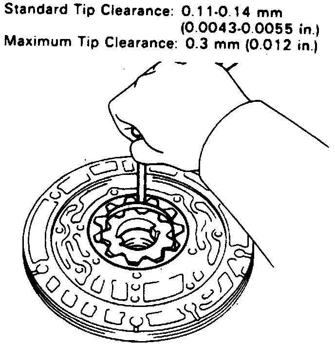 2. Using a suitable feeler gauge, measure distance between gear teeth and crescent shaped part of pump body for both gears. If clearance exceeds .012 inch, replace drive gear, driven gear or pump body as necessary, Fig. 8.