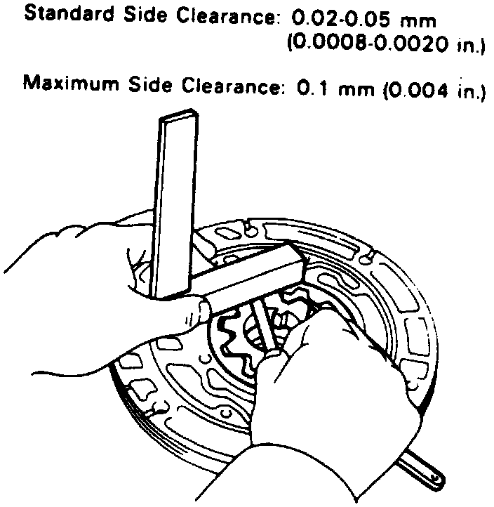 3. Using a suitable straightedge and feeler gauge, check side clearance of both gears as shown, Fig. 9.