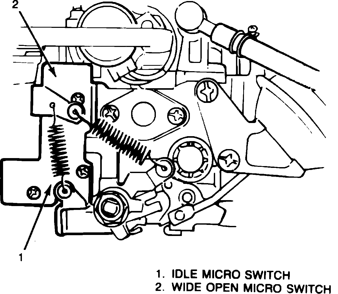 Throttle position is monitored by Wide Open Throttle (WOT) and idle micro switches mounted on the carburetor, Fig. 4.