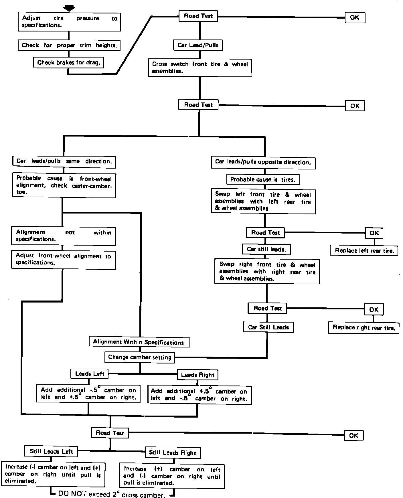 Do not use the charts in the 1987 Cavalier, Celebrity, Corsica or Beretta chassis service manuals. This chart provides a more consistent and efficient method of diagnosis and correction of lead/pull comments by calling for the front tires and wheels to be cross-switched before any alignment checks or corrections are made. Many lead/pull comments have been traced to tire conicity conditions and the revised charts will lead to quicker identification and correction of this condition.
