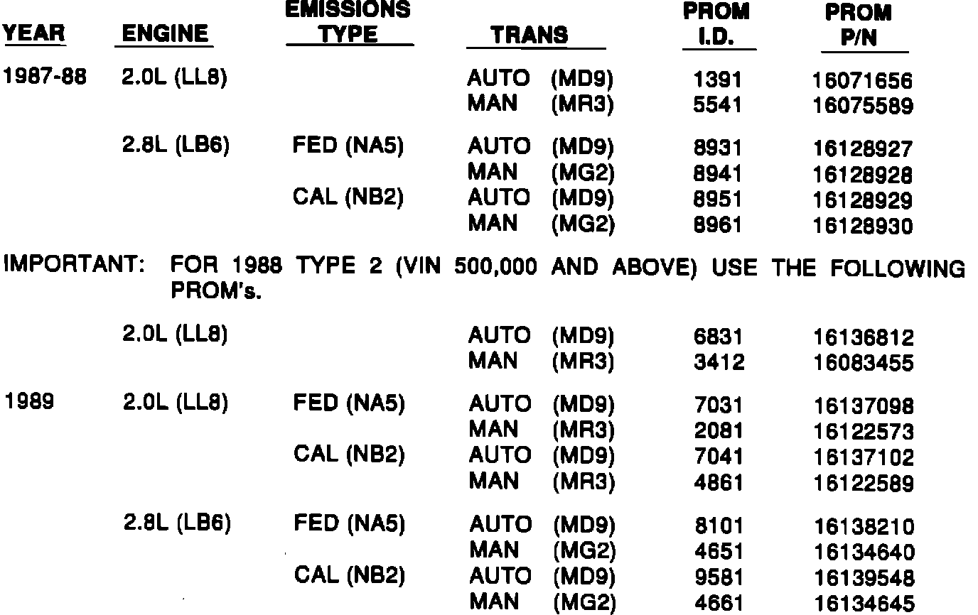 - THE ATTACHED CHART LISTS THE MOST RECENT MEM-CAL (PROM) PART NUMBERS FOR THE VARIOUS 1987-89 BUILD COMBINATIONS. THIS MAY BE USED AS A REFERENCE FOR CUSTOMER COMMENTS OF INACCURATE OR ERRATIC SPEEDOMETER/ODOMETER. OPERATION.