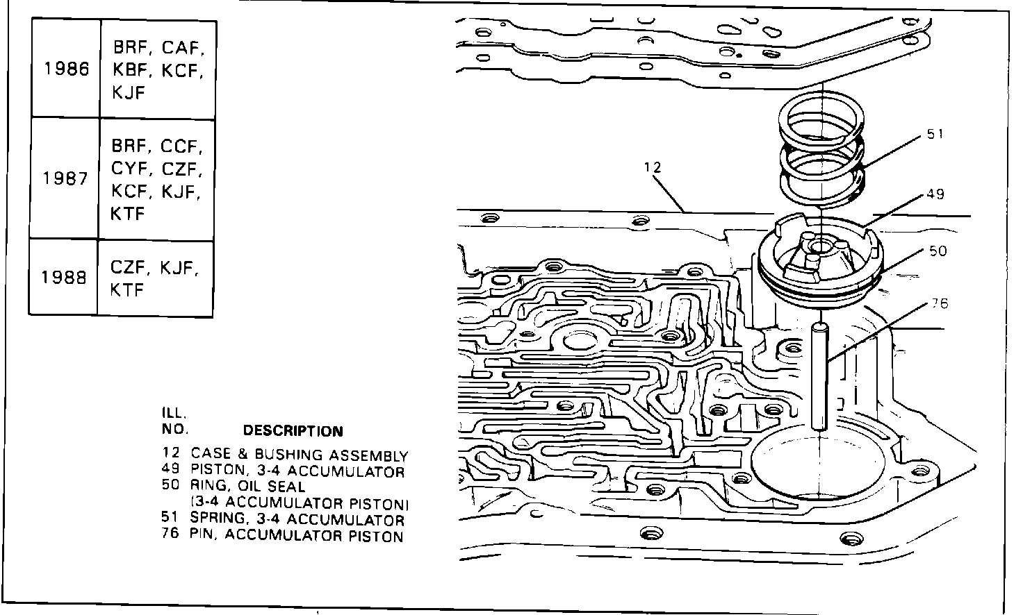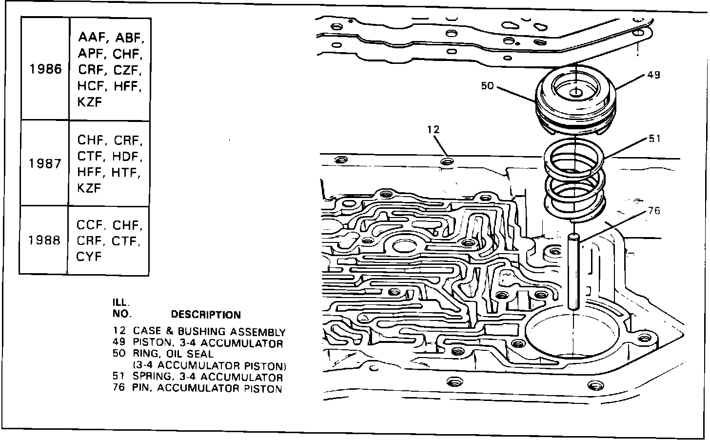 When servicing a THM 200-4R transmission, refer to the illustrations to check the positioning of the 3-4 accumulator piston and spring for all 1986, 1987 and 1988 models.