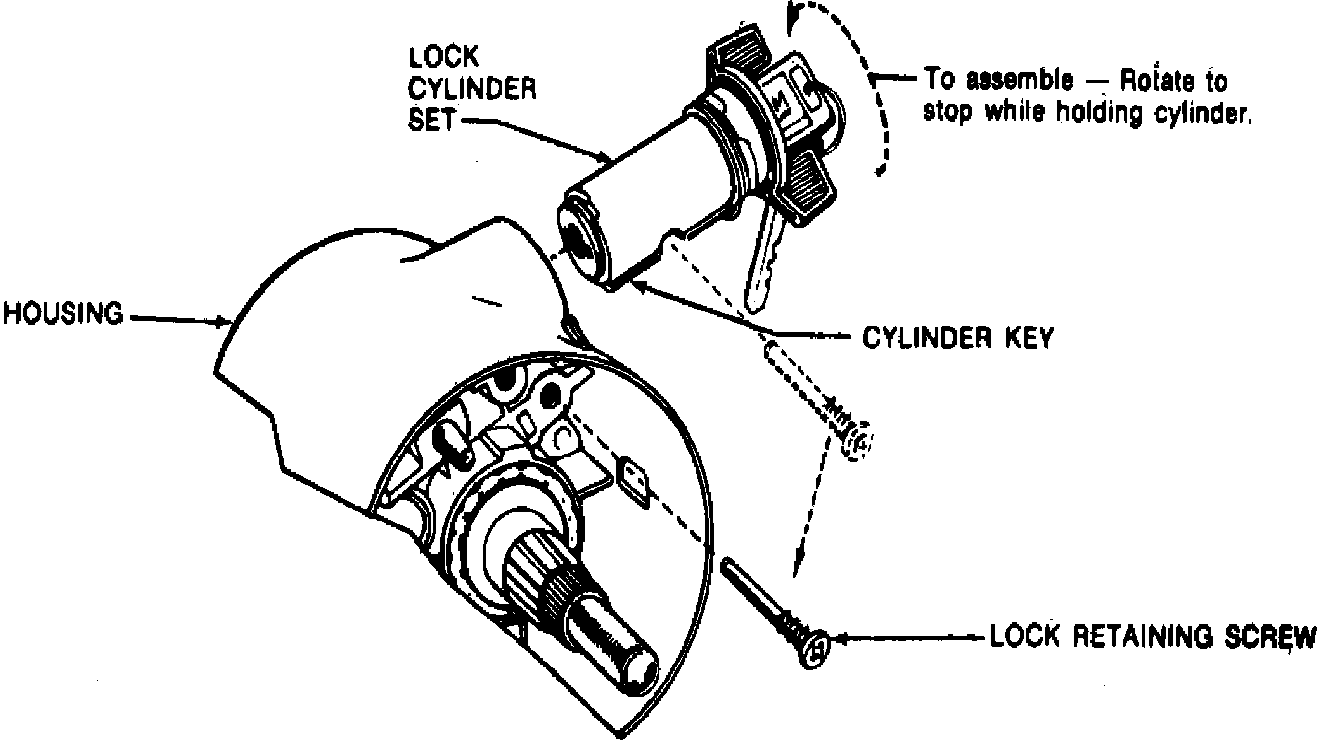5. On all models, install by rotating lock cylinder to stop while holding housing, Fig. 1. Align cylinder key with keyway in housing, then push lock cylinder assembly into housing until fully seated.