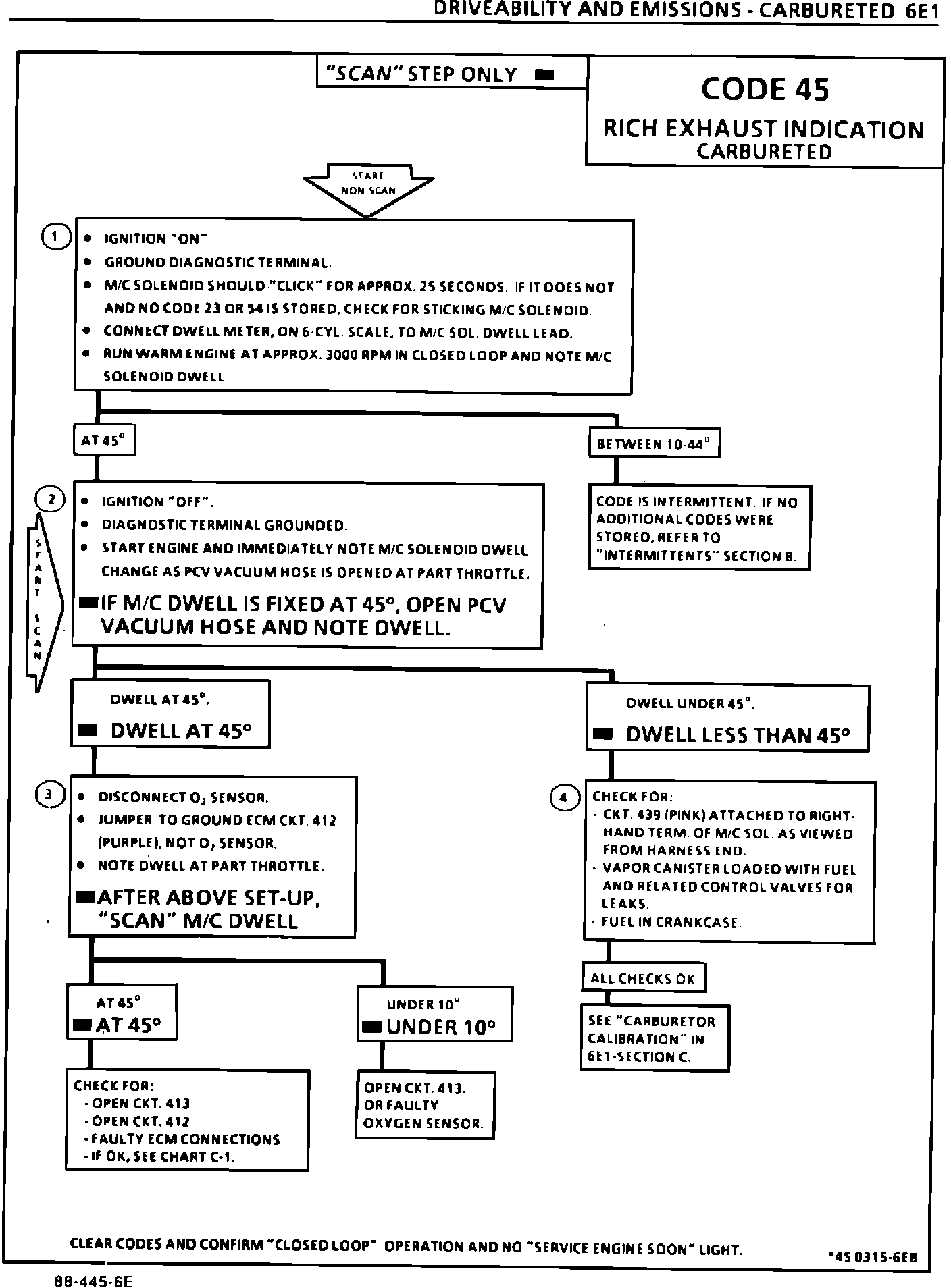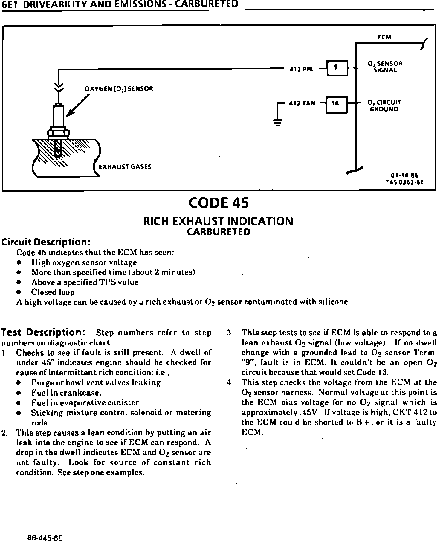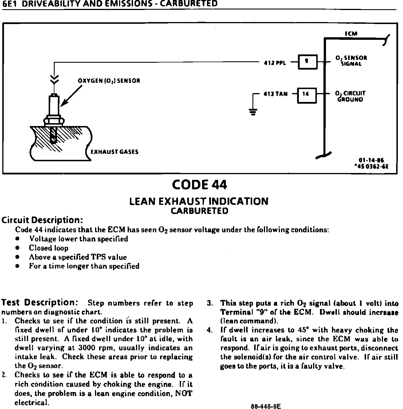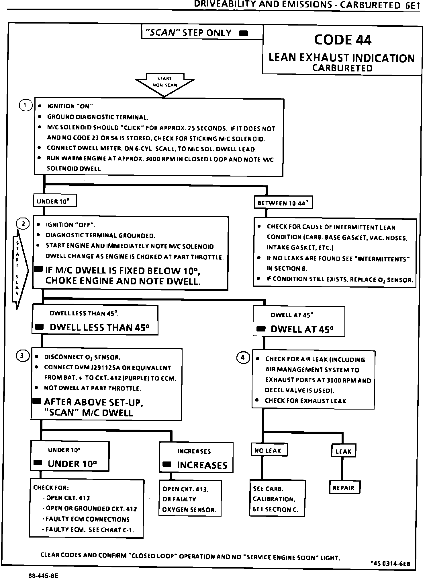 The information in this bulletin replaces the Code 44 (Lean Exhaust) and Code 45 (Rich Exhaust) Diagnostic Charts and Facing Pages found in DRIVEABILITY AND EMISSIONS (SECTION 6E1) of the 1987-1988 5.0L (VIN G/H) and 5.7L (VIN 6) "B" and "F" Carline Service Manuals.