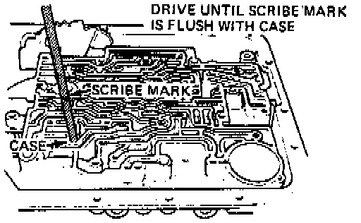 c. Using suitable tool, drive check valve assembly until seated in case. To ensure correct installation depth, scribe a mark at 1.653 inch on a 3/8 inch diameter metal rod, then seat the 3rd accumulator and ball assembly as shown in Fig. 27. When the scribed line is flush with the case, installation depth is correct.