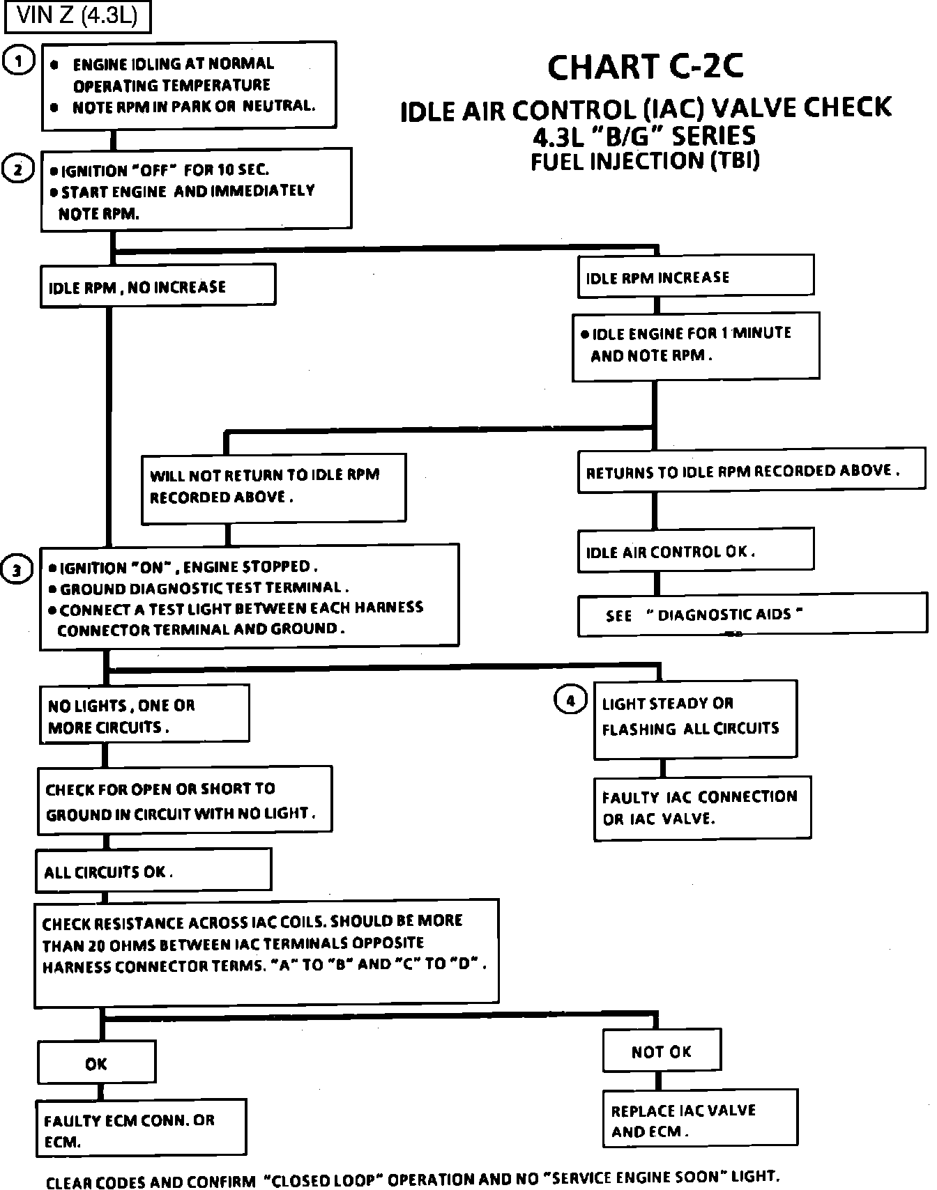 1. Continue with test, even if engine will not idle. If idle is to low, "Scan" will display 80 or more counts, or steps. If idle is high, it will display "O" counts. Occasionally, an erratic or unstable idle may occur. Engine speed may vary 200 rpm, or more, up and down. Disconnect IAC. If the condition is unchanged, the IAC is not at fault.