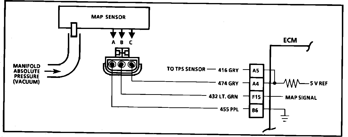 Circuit Description: The Manifold Absolute Pressure Sensor (MAP) measures manifold pressure (vacuum) and sends that signal to the ECM. The MAP Sensor is mainly used for fuel calculation, when the ECM is running in the throttle body backup mode. The MAP Sensor is also used to determine the barometric pressure and to help calculate fuel delivery.