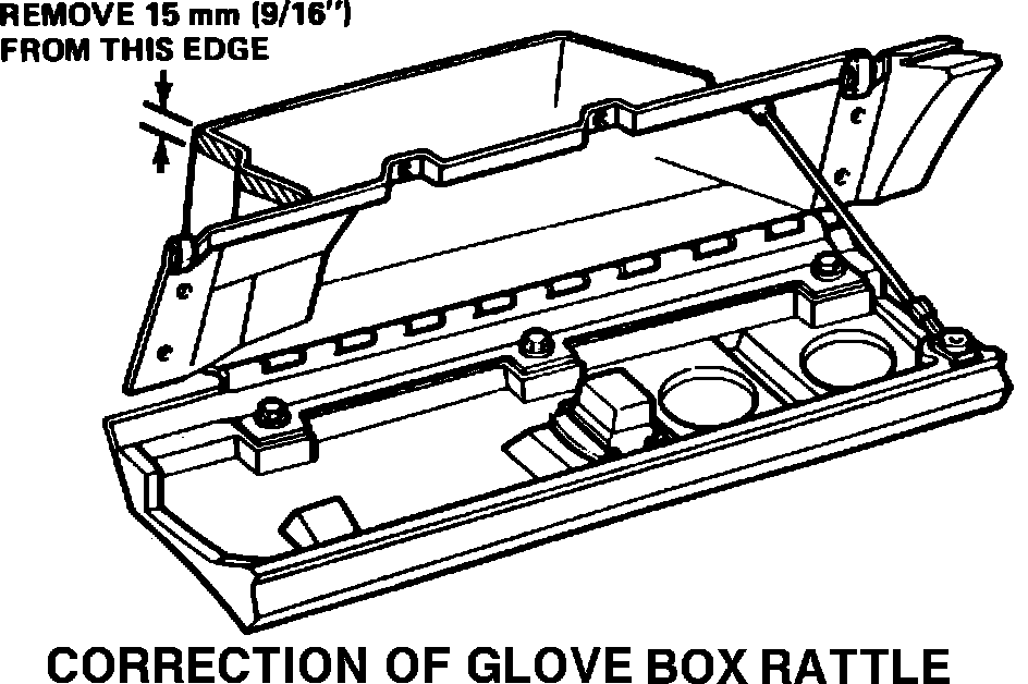 Customer comments may be received of a rattle in the glove box area of the instrument panel. The ECM bracket can contact the glove box at the left edge. To correct this condition, trim 15 mm of material off the top edge of the left side of the glove box as shown in the illustration. This will provide clearance for the ECM bracket.