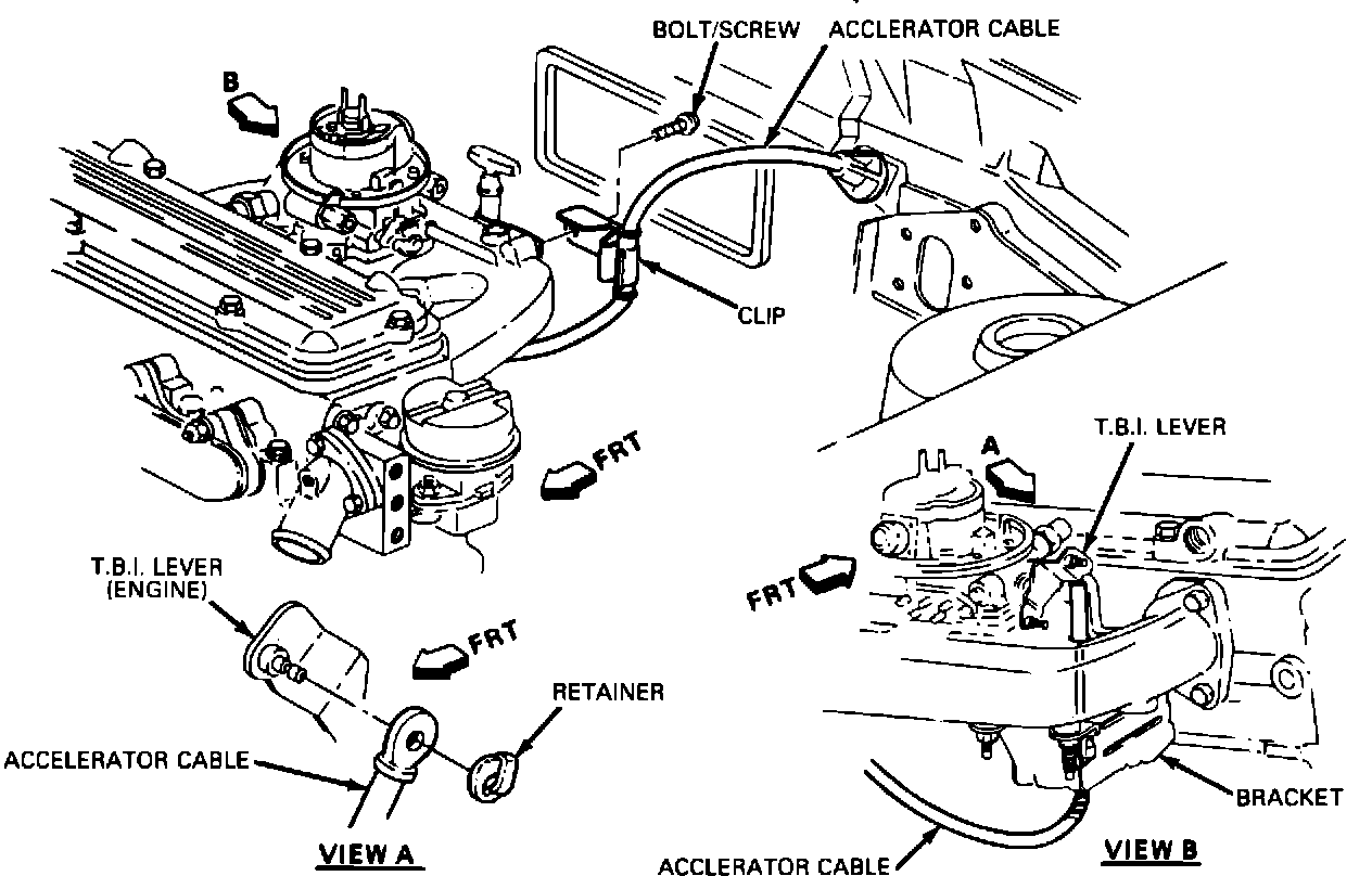 5. Remove retainer that attaches accelerator cable to T.B.I. lever (View A, Figure 2).