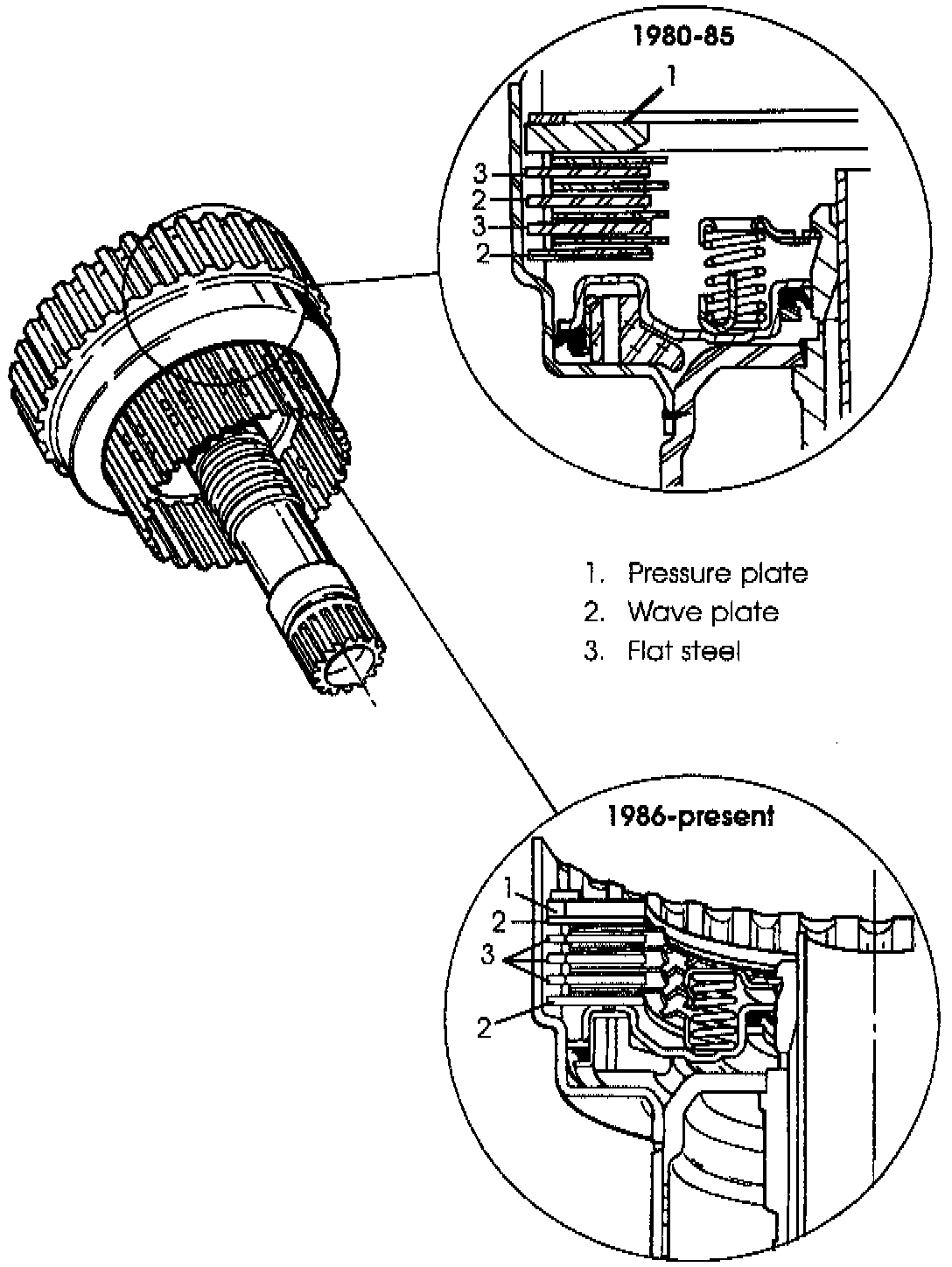 Proper clearance for the forward clutch is 025"-.035". Proper clearance for the direct clutch is .040"-.070". Also, on 1980-85 units, forward engagement can be further enhanced by adding a second wave plate as shown in the illustration. 1986 and later units already have this.