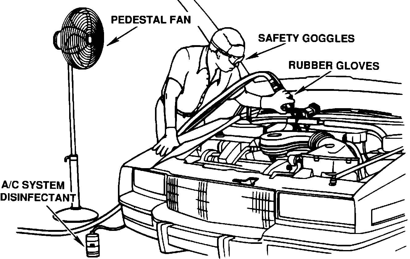 1. Put on rubber gloves and safety goggles.2. Pour the small bottle of the air conditioning system disinfectant kit, P/N 25533404 into the large bottle. Seal and invert the large container once or twice to mix the contents.