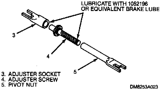 1. Apply brake lubricant P/N 1052196 or equivalent to the adjusting screw (4) threads, inside diameter of socket (3) and socket face.