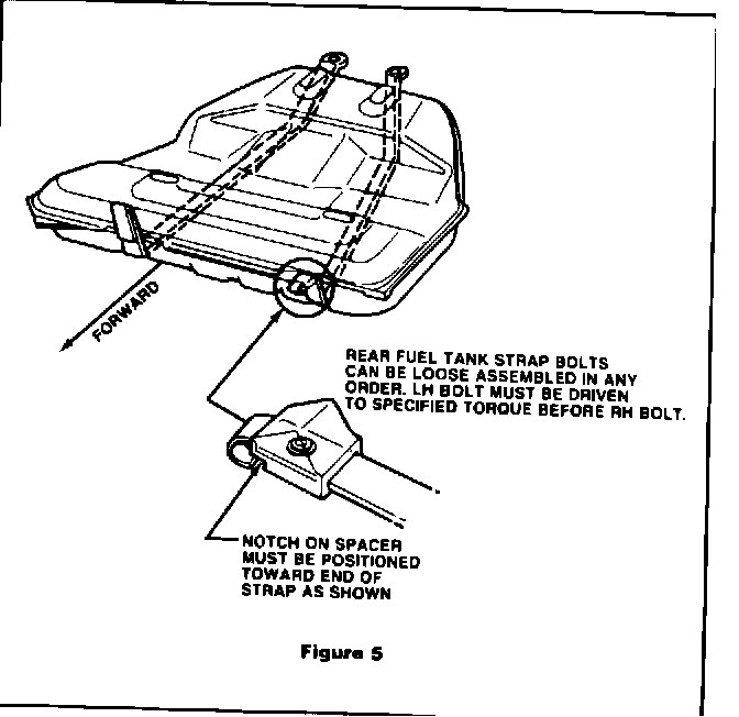 12. Insure fuel tank strap spacer located on L.H. strap is properly positioned under forward flange of tank, (Figure 5) . Torque L.H. strap bolt and then R.H. bolt to 25 ft.lbs. (34 N-m).