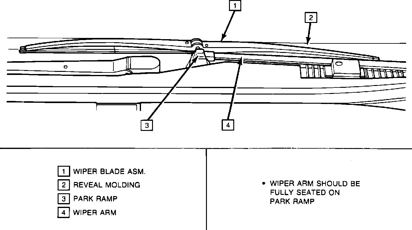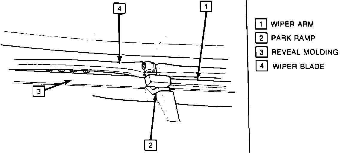 Check Fit Of Windshield Reveal Molding (Figure 1) on vehicles equipped with depressed park (hidden) wiper blades and a windshield lower reveal molding, check the fit of the reveal molding across the base of the windshield. The lower reveal molding must fit uniformly along the glass surface to allow the wiper blades to move freely from the glass wipe area to the park position when the wipers are turned off. Gaps in excess of 1.0 mm (.040 in.) should be corrected using the following procedure.