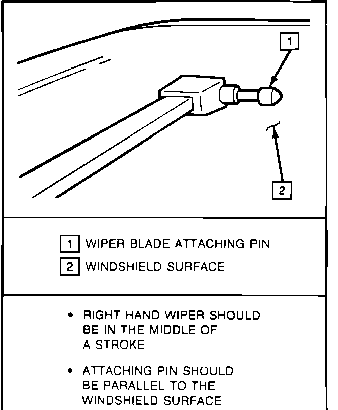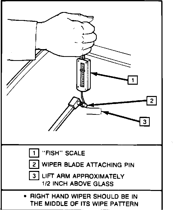 1. Turn on ignition switch and wipers. When the right hand wiper is in the middle of a wipe stroke, stop the wiper system by turning off the ignition switch. Proceed with the following steps to measure the right hand arm pressure. Prior to measuring the left hand arm pressure be sure the left hand arm is in the middle of the wipe stroke.
