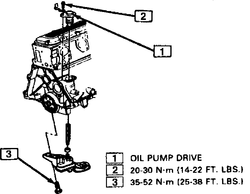 2. Install oil pump assembly retaining bolt to rear main bearing cap and torque bolt to 25---38 ft. lbs.