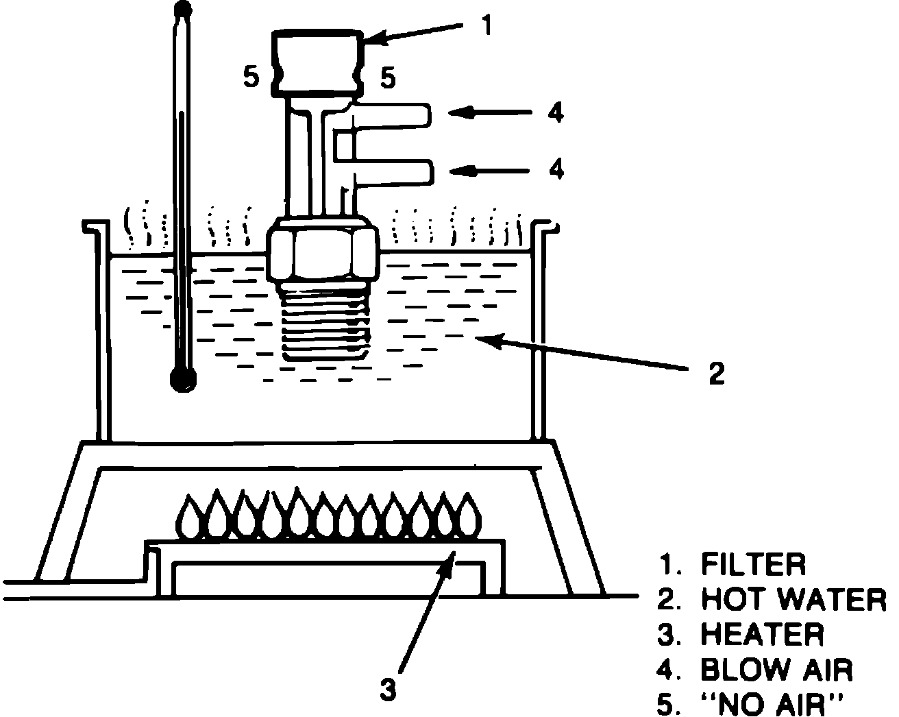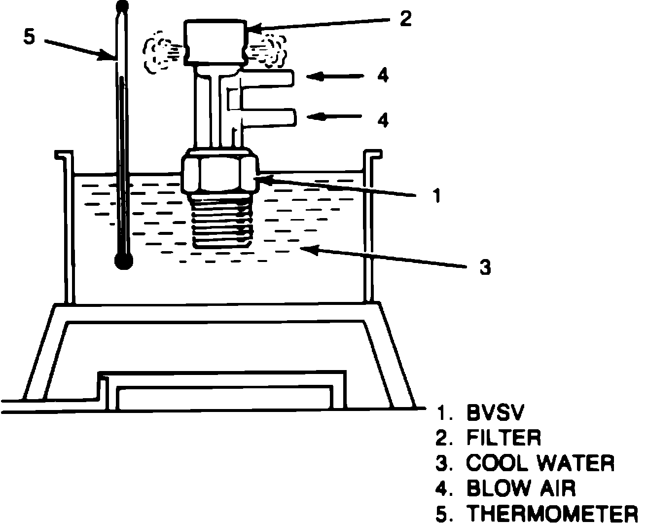 4. With BVSV heated above 140°F (60°C) in hot water, blow air into each nozzle individually, Fig. 15. Air should not escape from filter.