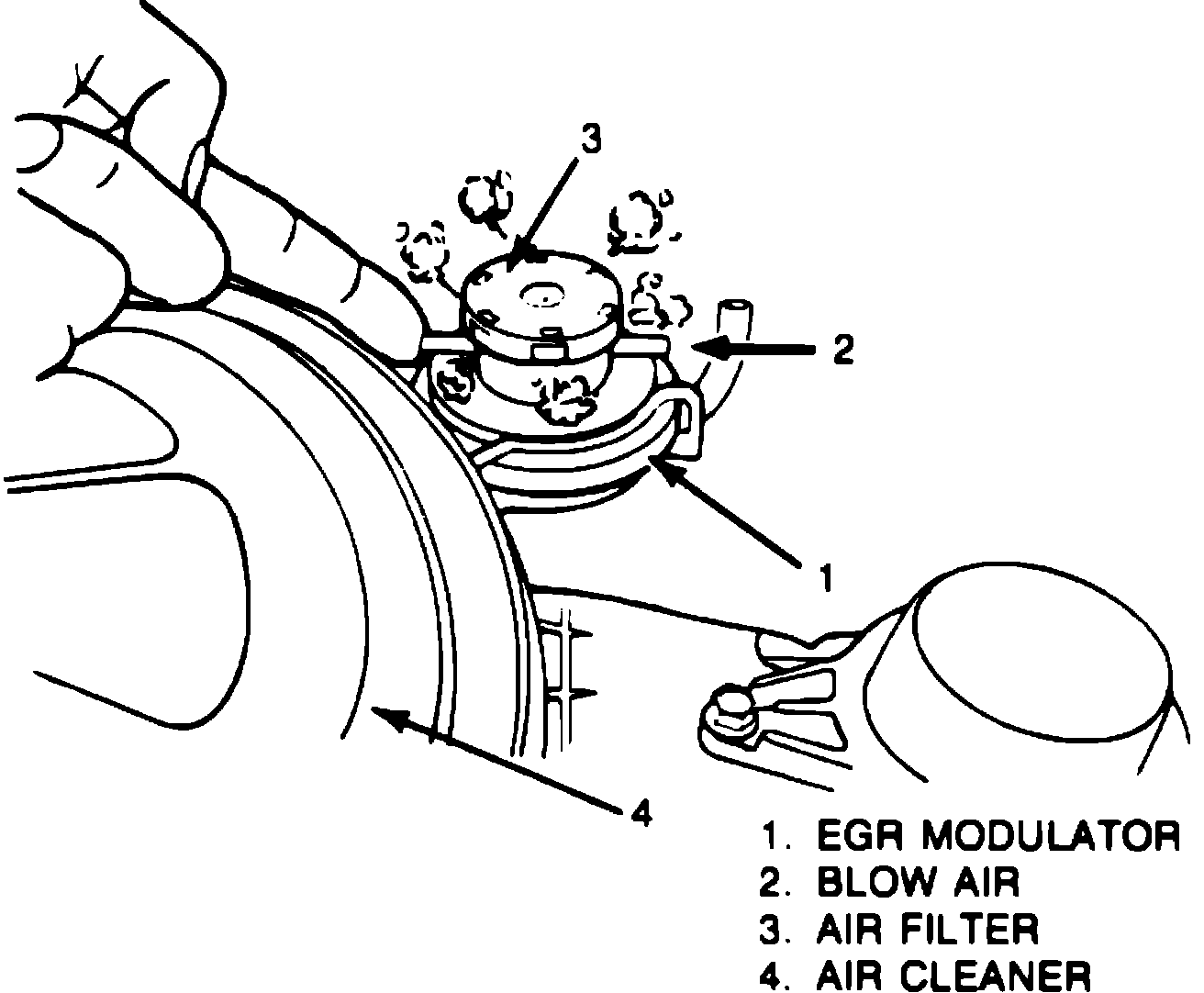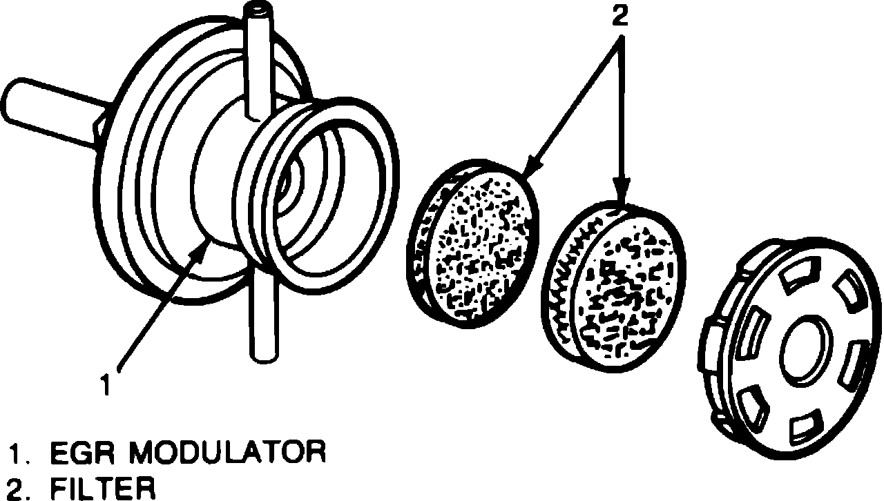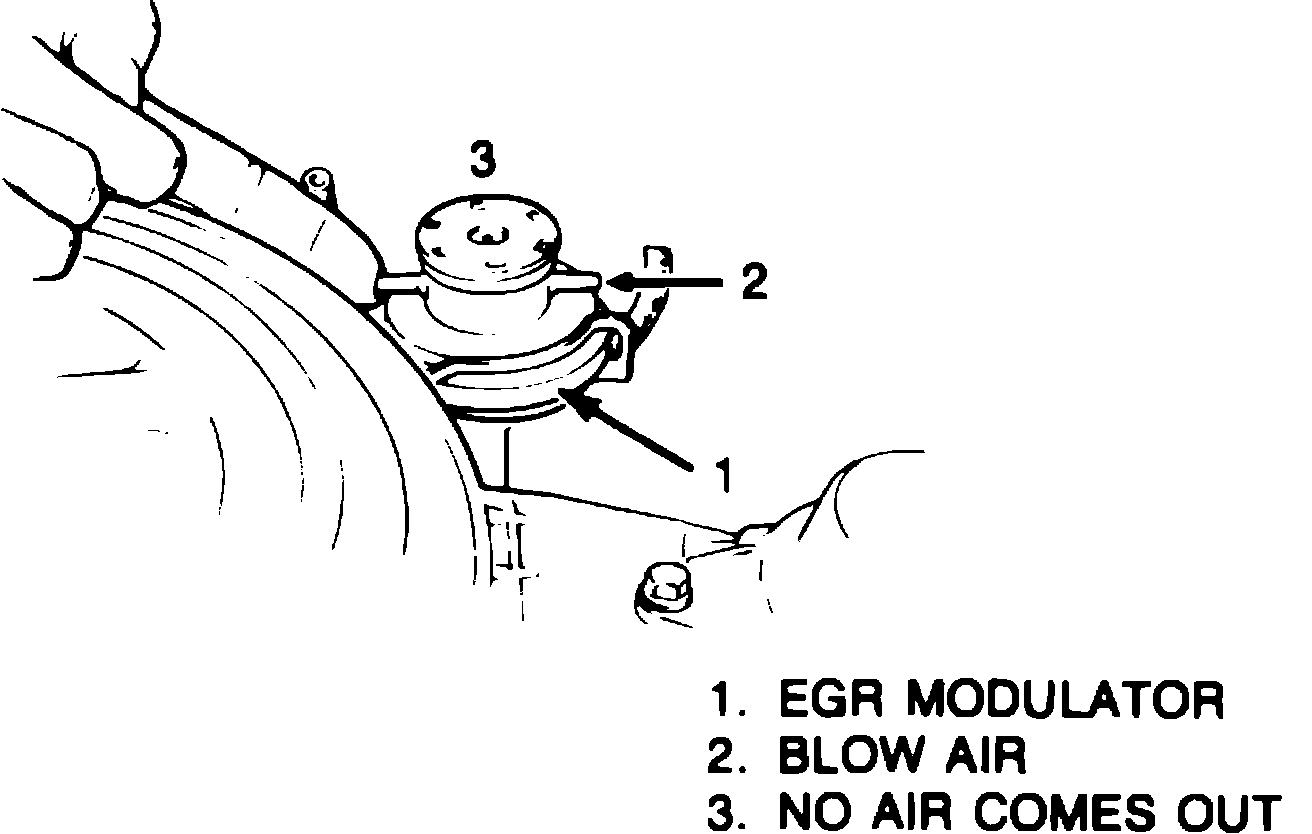 2. With engine off, disconnect 2 vacuum hoses from EGR modulator and plug nozzle. Blow air into other nozzle and check that air escapes freely through filter, Fig. 17.