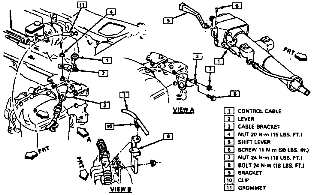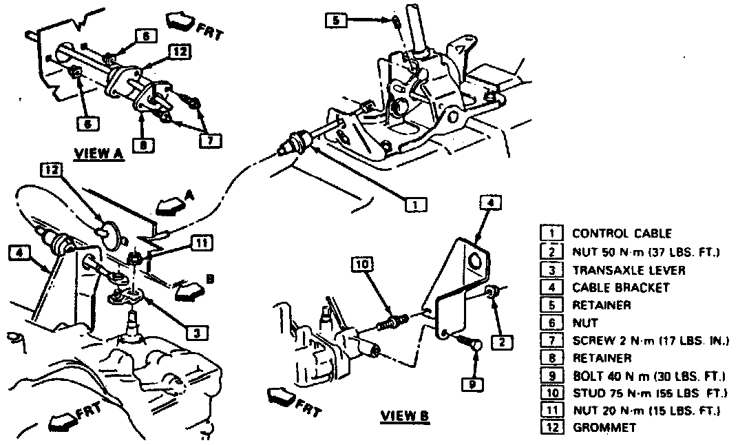 3. Loosely assemble retainer, bushing and shift cable to pin and bracket, see figures, then torque attaching nut to specifications.