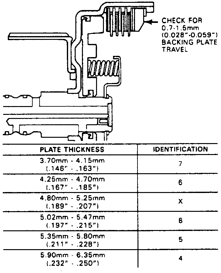b. Using a feeler gauge, measure distance between snap ring and backing plate. Backing plate travel should be 0.028 - 0.059 inch.