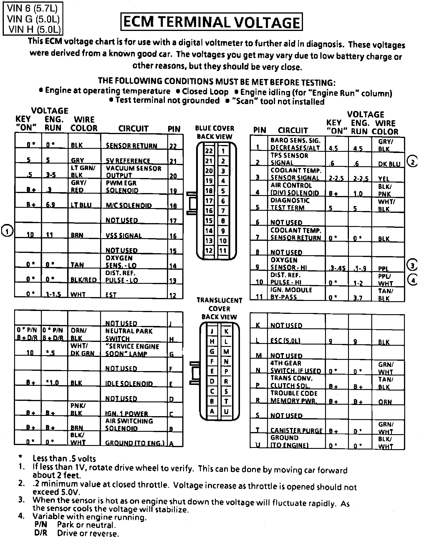 Fig. 053 - ECM Connector Terminal Identification & Voltage Specifications.: