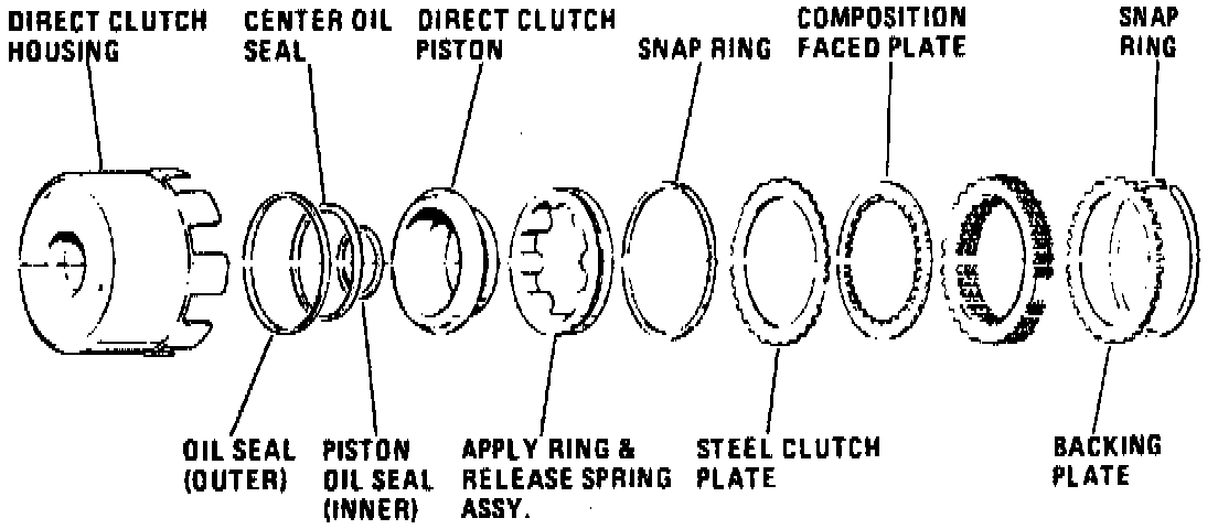 1. Remove snap ring, backing plate, composition and steel clutch plates, apply ring snap ring, apply ring and release spring assembly, direct clutch piston and oil seals (3), Fig. 63.