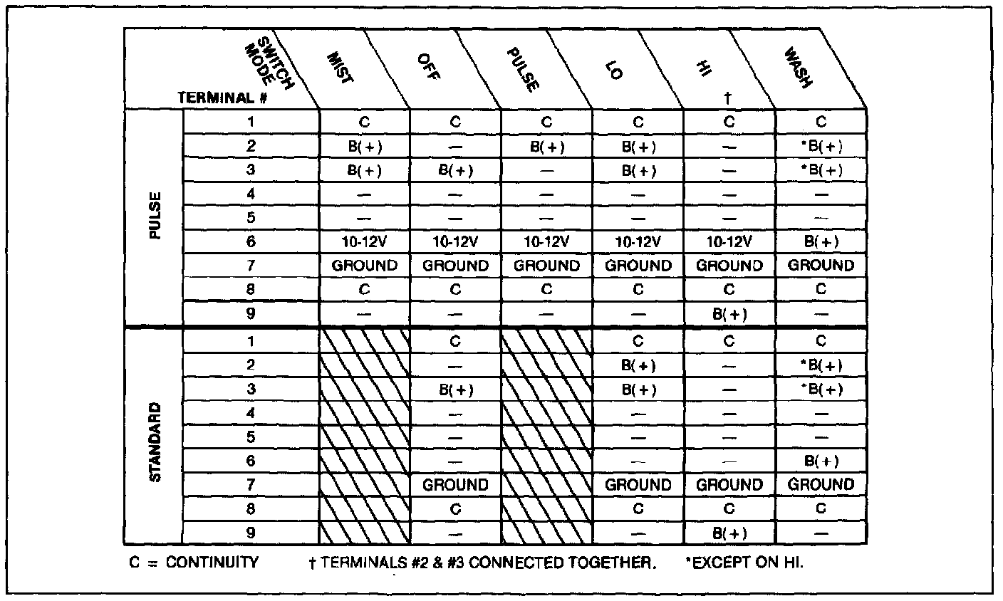 1. Apply a (+) 12 volt DC (source) voltage to wiper connector pins as shown in Fig 5. If the motor runs in all operating modes (LO, HI, PARK & PULSE), perform the voltage and continuity wiper switch tests as shown on Fig 6, 7, and 8.