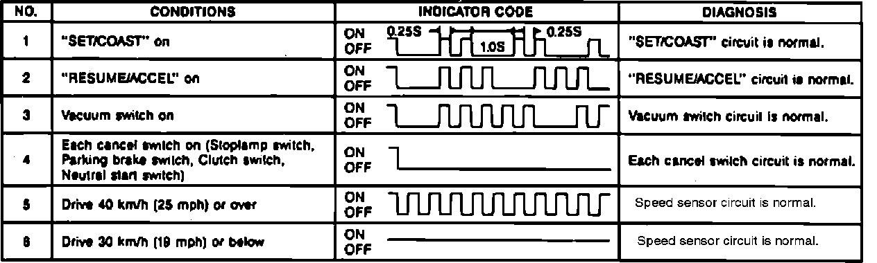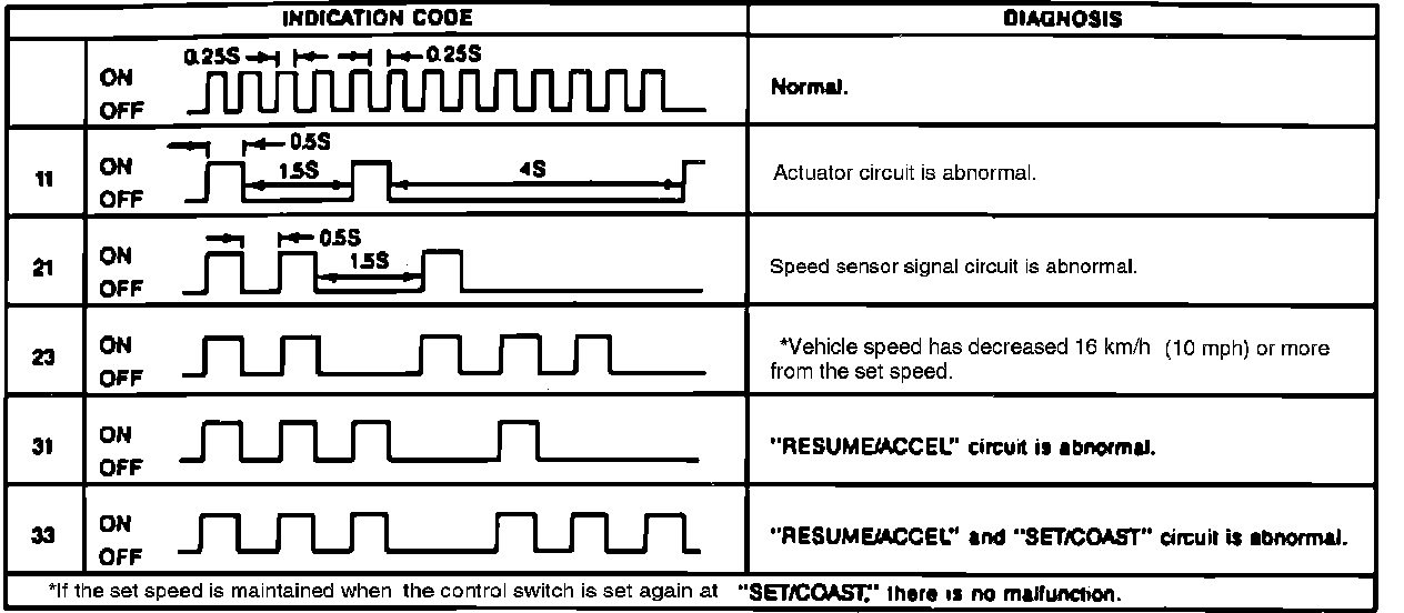 b. While driving at a speed of no more than 10 mph, press set/coast switch three times within two seconds. In order to save diagnostic code(s) when a malfunction has occurred, always inspect with ignition and main switches on. Should the power be cut, the diagnostic code(s) will be erased from the computer memory. If there is no indication code, refer to DIAGNOSTIC CHARTS.