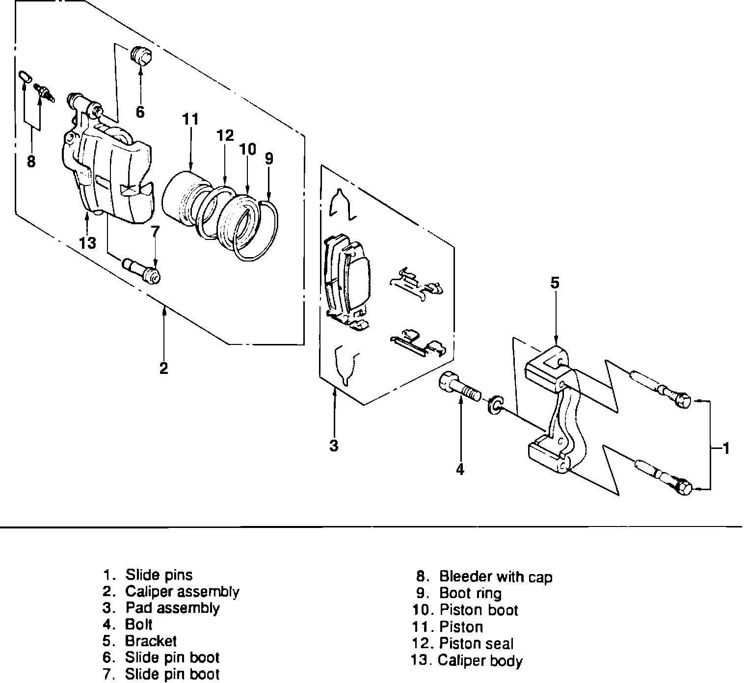 Fig. 2 Exploded view of disc brake caliper assembly. 1987-88 turbocharged models: