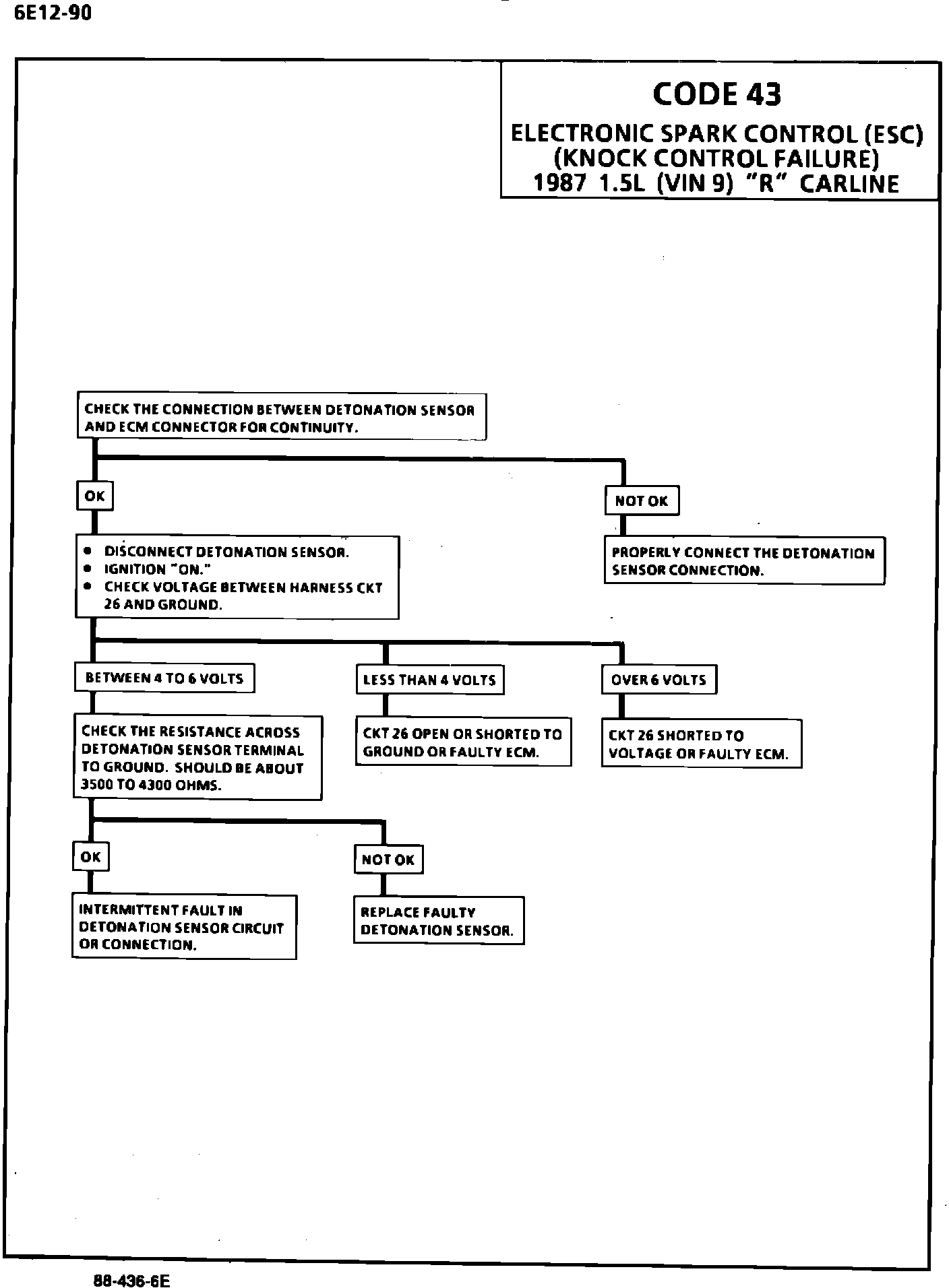 This chart will replace the present Code 43 Chart (Electronic Spark Control (ESC) Knock Control Failure) in Section 6E "Driveability And Emissions" in all 1987-1988 "R" Service Manuals with 1.5L (VIN 9) turbo engine applications.