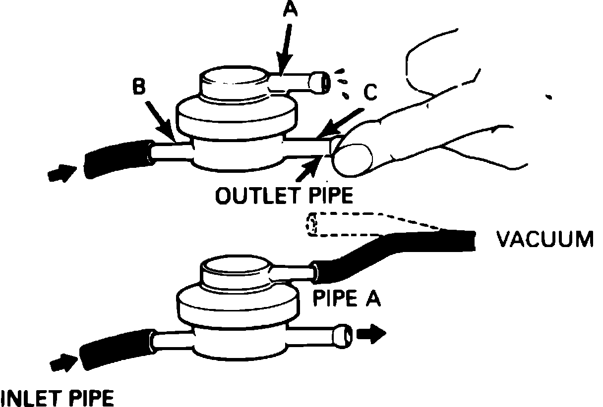3. Apply pressure to inlet pipe (B) with outlet pipe (C) capped. Ensure air does not pass through valve.