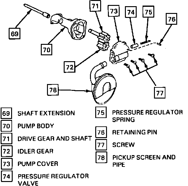 13. Reverse procedure to assemble. Turn drive shaft by hand to check for smooth operation. The pump gears and body are not serviced separately. If the pump gears or body are damaged or worn, the pump assembly should be replaced. Also, if the pick-up screen and pump assembly was removed, it should be replaced with a new one as loss of the press fit condition could result in an air leak and loss of oil pressure.