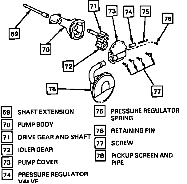 13. Reverse procedure to assemble. Turn drive shaft by hand to check for smooth operation. The pump gears and body are not serviced separately. If the pump gears or body are damaged or worn, the pump assembly should be replaced. Also, if the pick-up screen and pump assembly was removed, it should be replaced with a new one as loss of the press fit condition could result in an air leak and loss of oil pressure.