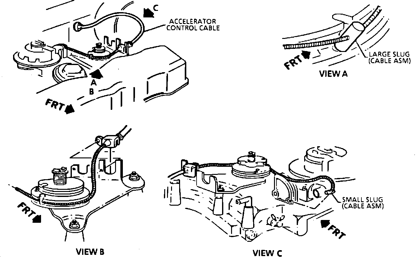^ Slip the accelerator control cable through the slot in the rod and then install the retainer in the rod, makeing sure it is seated. Use care when pressing the retainer into the hole in the rod to ensure that the cable is not kinked or damaged in any way.